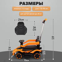 • Высота с ручкой 86см • Высота без ручки • Диаметр колеса 15см • Ширина колеса 5см • Диаметр руля 19см • Длина сидения 27см • Ширина сиденья 16см • Высота спинки сидения 26,5 см • Ширина спинки сиденья 21см • Высота от пола до сидения 23см • Высота от поля до руля 39см • Высота от пола до подножки 8см • Высота от пола до стопора 2см
