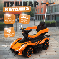 Легкий и надежный толокар с поворотным рулем, сиденьем из эко-кожи, со звуковыми и световыми эффектами. Такой толокар станет отличным подарком — игрушка подойдет как для мальчика, так и для девочки. Особенности каталки: Съемные родительская ручка и бампер безопасности. Поворотный музыкальный руль. Толокар изготовлен из прочного пластика — не деформируется и хорошо справляется со столкновениями во время игр. Благодаря родительской ручке с машиной каталкой удобно отправиться с ребенком в магазин или на детскую площадку. Руль поворачивает передние колеса толокара. Бампер безопасности защищает вашего малыша от падений Машина каталка весит 4 килограмм — удобно брать с собой на прогулку. Сиденье из эко-кожи, под сиденьем отсек для батареек. Для работы светомузыкальных эффектов соедините провод от руля с проводом под корпусом и вставьте 3 батарейки типа АА (в комплект не входят). Большая кнопка «вкл/выкл» издает звук зажигания, после чего становятся активными другие 4 кнопки: гудок, пауза и проигрывание мелодий (всего 4 мелодии), переключение мелодий, режим имитации радио. Также есть разъемы под aux-кабель и usb. Первая и третья кнопки прибавляют и убавляют звук. Во время проигрывания музыки, фары горят белым светом. Толокар можно использовать в трех вариантах: • С родительской ручкой, подножками и бампером безопасности — как коляску для самых маленьких • С родительской ручкой и подножками — для малышей постарше • Без ручки и бампера — как беговел