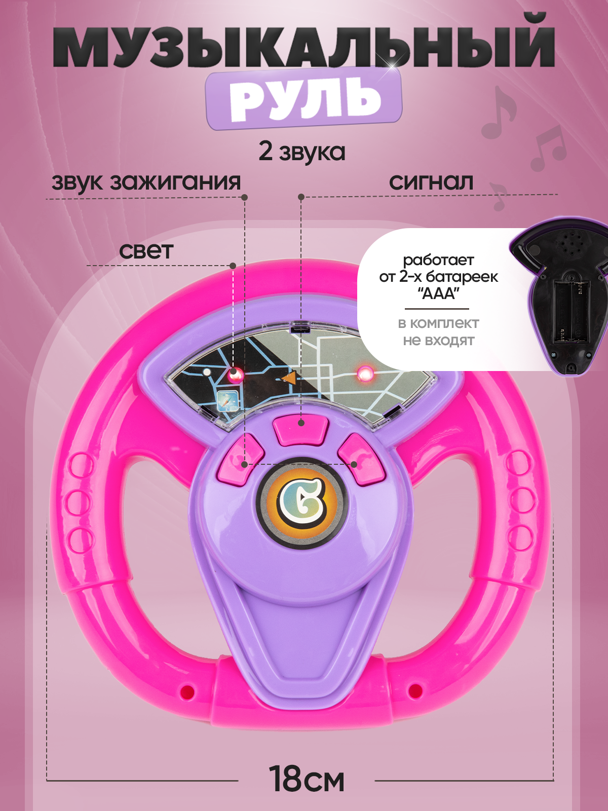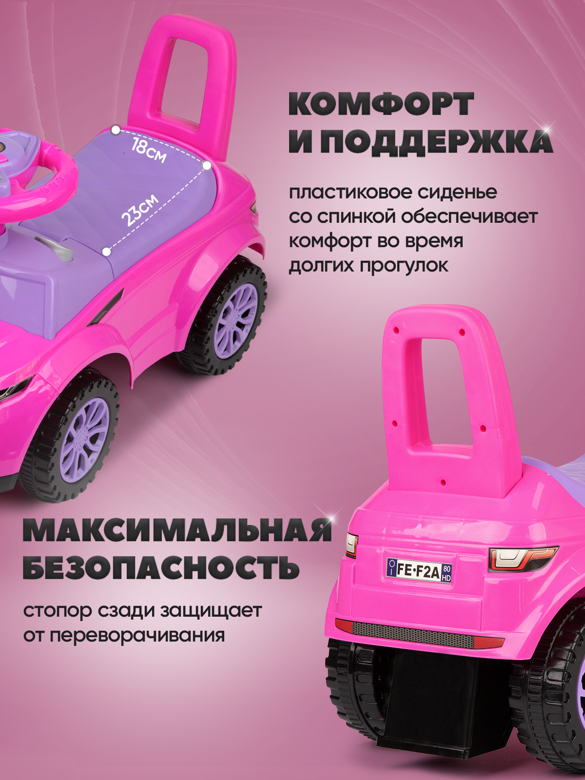 музыкальные и световые эффекты на руле; отсек для игрушек под сиденьем; движение: вперед-назад; поворотный руль; эргономичная форма без острых углов; защита от опрокидывания спереди и сзади