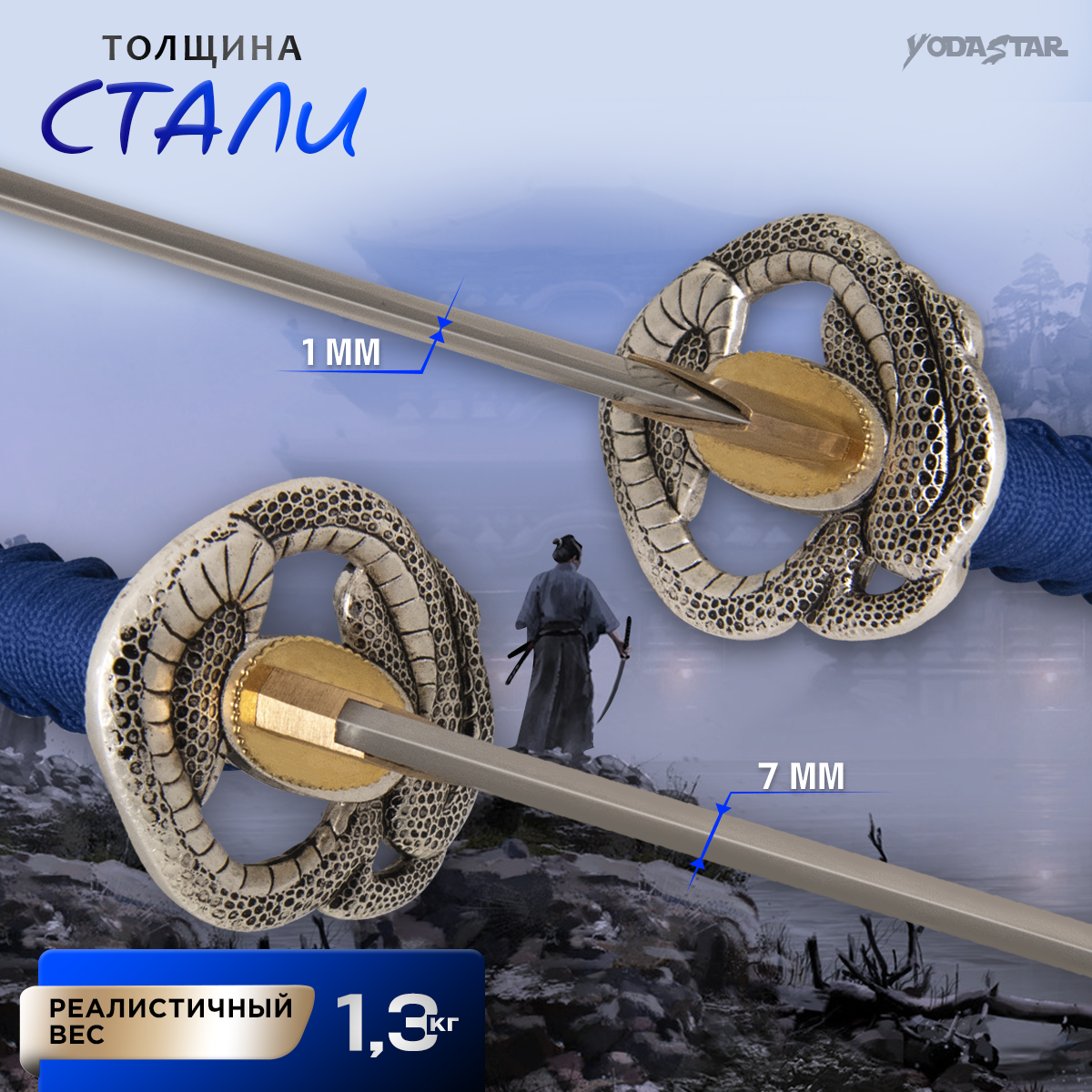 Японская сувенирная катана Storm Shogun - пронизана историей восточной культуры и является культовым символом чести самураев и холодной эстетики японских кузнецов-виртуозов. Превосходное качество и мастерство работы, используемые в изготовлении каждой детали, приводят к созданию не просто сувенирного меча, а поистине неповторимого произведения искусства. Изысканно оформленная и детально проработанная катана металлическая станет великолепным дополнением к вашей коллекции или украшением для интерьера или воссоздания камиданы. Клинок японской катаны изготовлен из высококачественной углеродной стали, обладающей непревзойденной прочностью и долговечностью. Лезвие для безопасности не заточено, но производит впечатление настоящего оружия. Благодаря своей длине в 103 сантиметра, эта железная катана становится не только исторически точной, но и эстетически привлекательной. Рукоять катаны самурая изготовлена из светлой древесины с декоративными вставками бога грома - серебряный змей, и покрытая традиционной обмоткой цука-маки, которая обеспечивает надежный захват и приятное ощущение во время использования. Ножны изготовлены из дерева и покрыты черным лаком с мерцающим и переливающимся синим градиентом, делая коллекционное оружие изысканным и стильным. Прекрасно выполненная стальная катана Storm Shogun, станет отличным подарком мужчине, брату, любимому, олицетворяя перерождение, долголетие и мудрость по фен-шуй. Создайте элегантный акцент в своем интерьере или дополните свою коллекцию с этой уникальной металлической сувенирной катаной. Самурайский меч отлично детализирован и прекрасно подойдет в качестве реквизита для косплея, заменяя опасные реплики и ножи из игр. Декоративная катана является сувенирным оружием, клинок не подвергается термической обработке и не заточен, для покупки не требуется отдельного разрешения. Данная катана из стали не является холодным оружием на территории РФ, имеется сертификат и протокол испытаний. В комплект к самурайскому мечу входят: ножны, тканевый мешок для переноски меча. Все предметы помещены для надежной доставки в плотную картонную коробку.