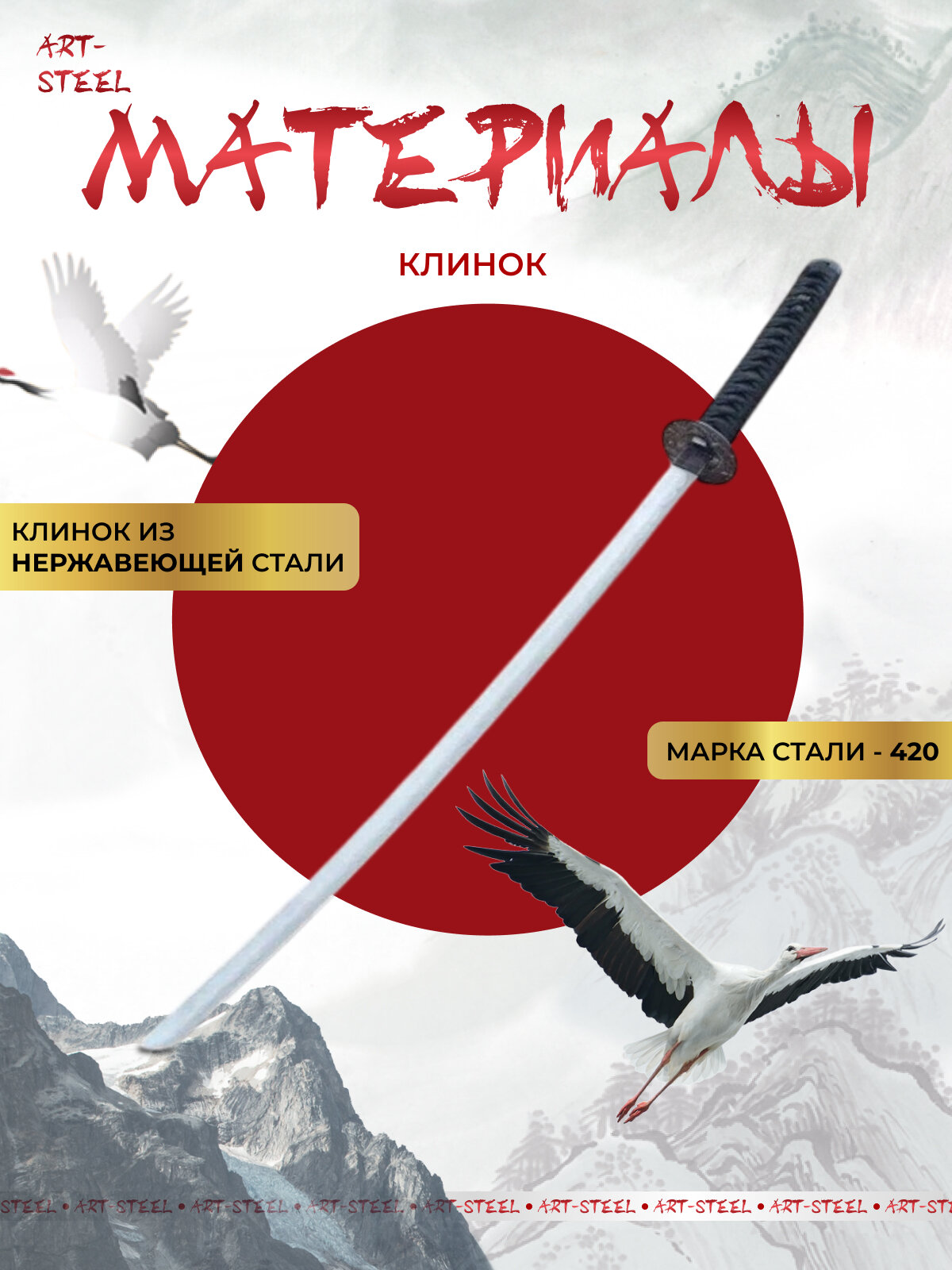 Данная катана металлическая - клинок изготовлен из высококачественной стали марки 420. Она является нержавеющей сталью, что позволяет клинку на протяжении долгого времени сохранять хороший внешний вид и свойства, даже в условиях повышенной влажности. Катана является сувенирной продукцией, кромка клинка не заточена.