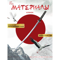 Данная катана металлическая - клинок изготовлен из высококачественной стали марки 420. Она является нержавеющей сталью, что позволяет клинку на протяжении долгого времени сохранять хороший внешний вид и свойства, даже в условиях повышенной влажности. Катана является сувенирной продукцией, кромка клинка не заточена.