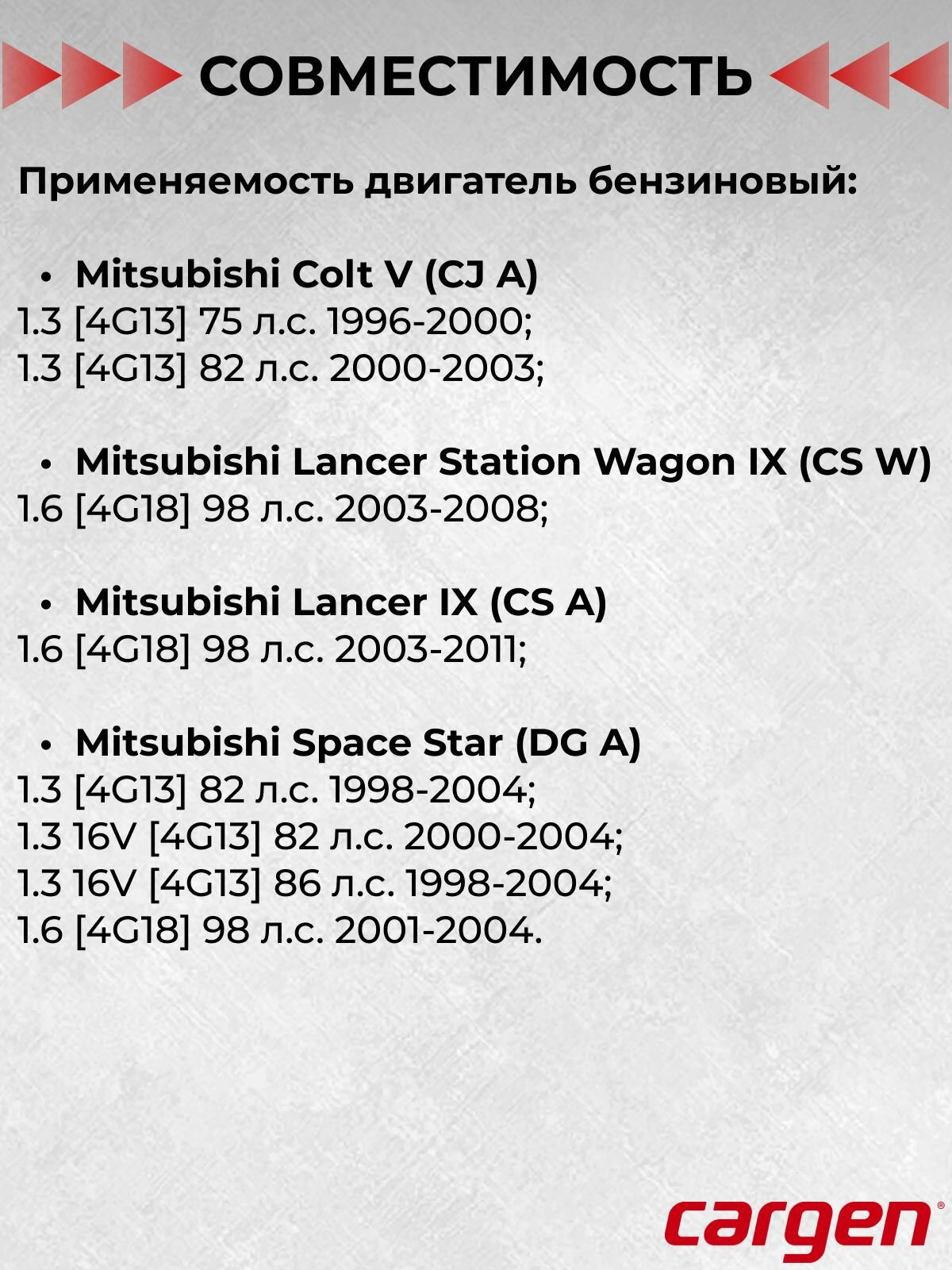 Cadillac Escalade, Chery Amulet, Chery Fora, Chery Tiggo, Chevrolet Avalanche, Chevrolet Aveo, Chevrolet Cruze, Chevrolet Kalos, Chevrolet Lacetti, Chevrolet Lanos, Chevrolet Rezzo, Chevrolet Silverado, Chevrolet Spark, Chevrolet Suburban, Chevrolet Tahoe, Daewoo Gentra, Daewoo Kalos, Daewoo Lacetti, Daewoo Lanos, Daewoo Leganza, Daewoo Matiz, Daewoo Nexia, Daewoo Nubira, Daewoo Rezzo, Fiat Sedici, GMC Sierra, GMC Sierra 1500, GMC Sierra 2500, GMC Yukon, Great Wall Safe, Honda Accord, Honda CR-V, Honda Civic, Honda FR-V, Honda HR-V, Honda Prelude, Honda Shuttle, Hummer H2, Hyundai Accent, Hyundai Elantra, Hyundai Getz, Hyundai Lantra, Hyundai Matrix, Hyundai Santa Fe, Hyundai Sonata, Hyundai Trajet, Kia Cerato, Kia Magentis, Kia Picanto, Kia Rio, Kia Sportage, LADA Vesta, LADA X-RAY, Mazda 2, Mazda 3, Mazda 323, Mitsubishi Colt, Mitsubishi Galant, Mitsubishi Lancer, Mitsubishi Santamo, Mitsubishi Space Star, Nissan Almera, Nissan Almera Tino, Nissan Altima, Nissan Cube, Nissan Micra, Nissan Note, Nissan Primera, Nissan Qashqai, Nissan Teana, Nissan Tiida, Nissan X-Trail, Opel Agila, Opel Astra J, Ravon Gentra, Ravon Nexia R3, Renault Clio, Renault Duster, Renault Kaptur, Renault Laguna, Rover 400, Subaru Forester, Subaru Impreza, Subaru Justy, Subaru Legacy, Suzuki Alto, Suzuki Carry, Suzuki Grand Vitara, Suzuki Ignis, Suzuki Liana, Suzuki SX4, Suzuki Splash, Suzuki Swift, Suzuki Vitara, Suzuki Wagon R, Volkswagen Golf, ГАЗ 2217, ГАЗ 3302 Газель, ГАЗ Газель, ГАЗ Соболь, ГАЗ-3307, ГАЗ-53, ГАЗ-66, ЗИЛ-130, ЗИЛ-131, ПАЗ-3205