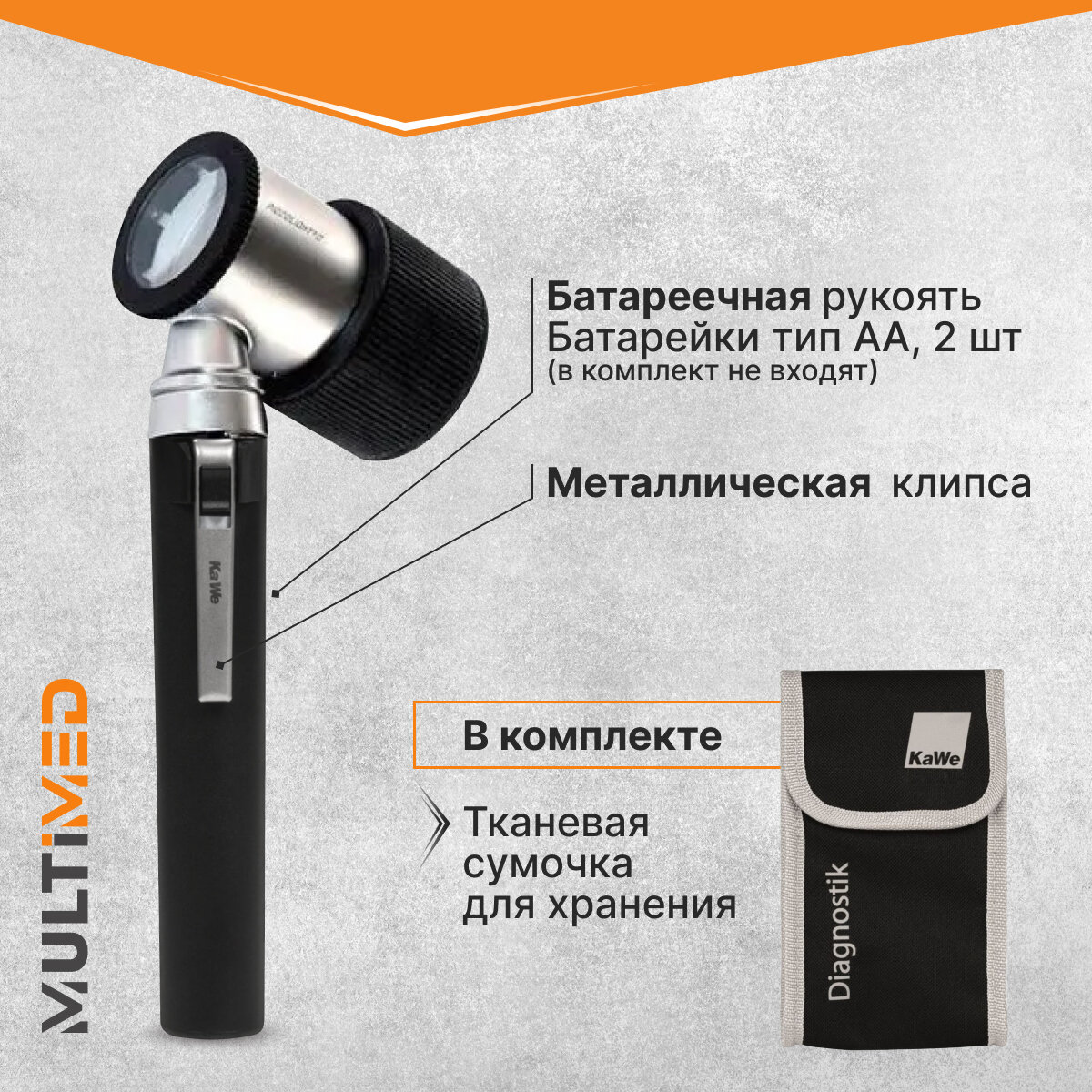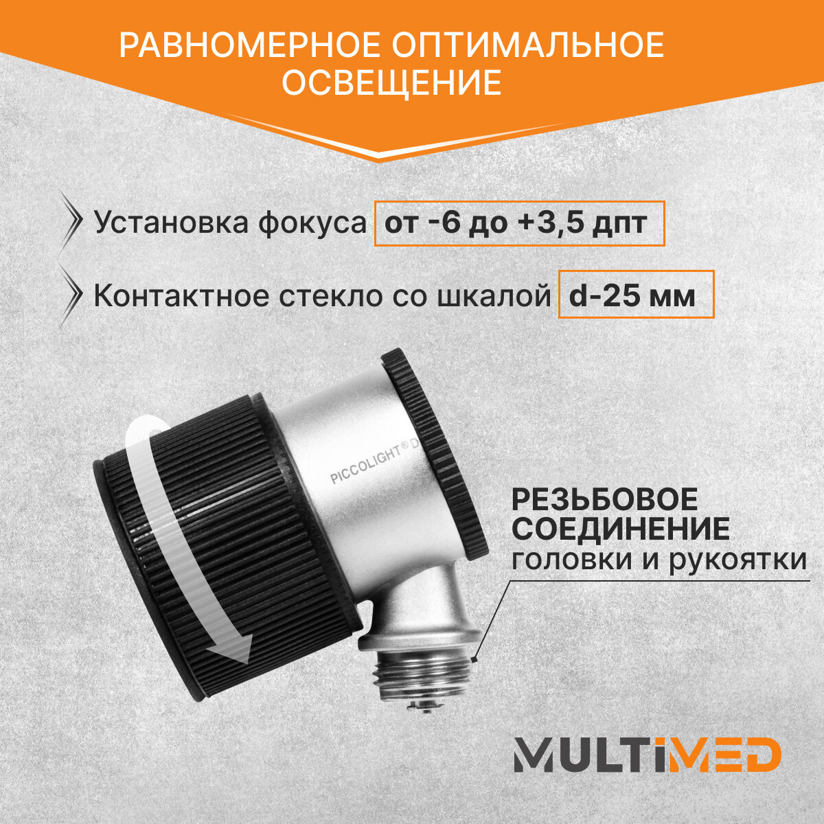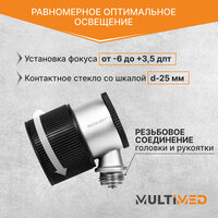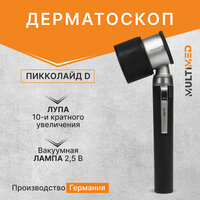 Пластиковая рукоять Головка металлическая Резьбовое соединение головки и рукояти Равномерное оптимальное освещение Лупа 10-и кратного увеличения Большое контактное стекло (Ø25 мм) со шкалой для раннего определения пигментационных изменений кожи Установка фокуса –6 до +3,5 дпт