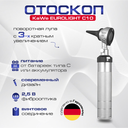 Отоскоп KaWe EUROLIGHT C10, вакуумный, 2,5 V, с ушными воронками, серебристый: сравнение цен, характеристики, фото, актуальное наличие и цены.