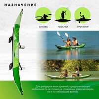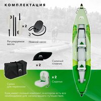 Комплектация: сумка для переноски, насос ножной, сиденье надувное регулируемое (2 шт.), весло для каяка (2 шт.), плавник для каяка (2 шт.).
