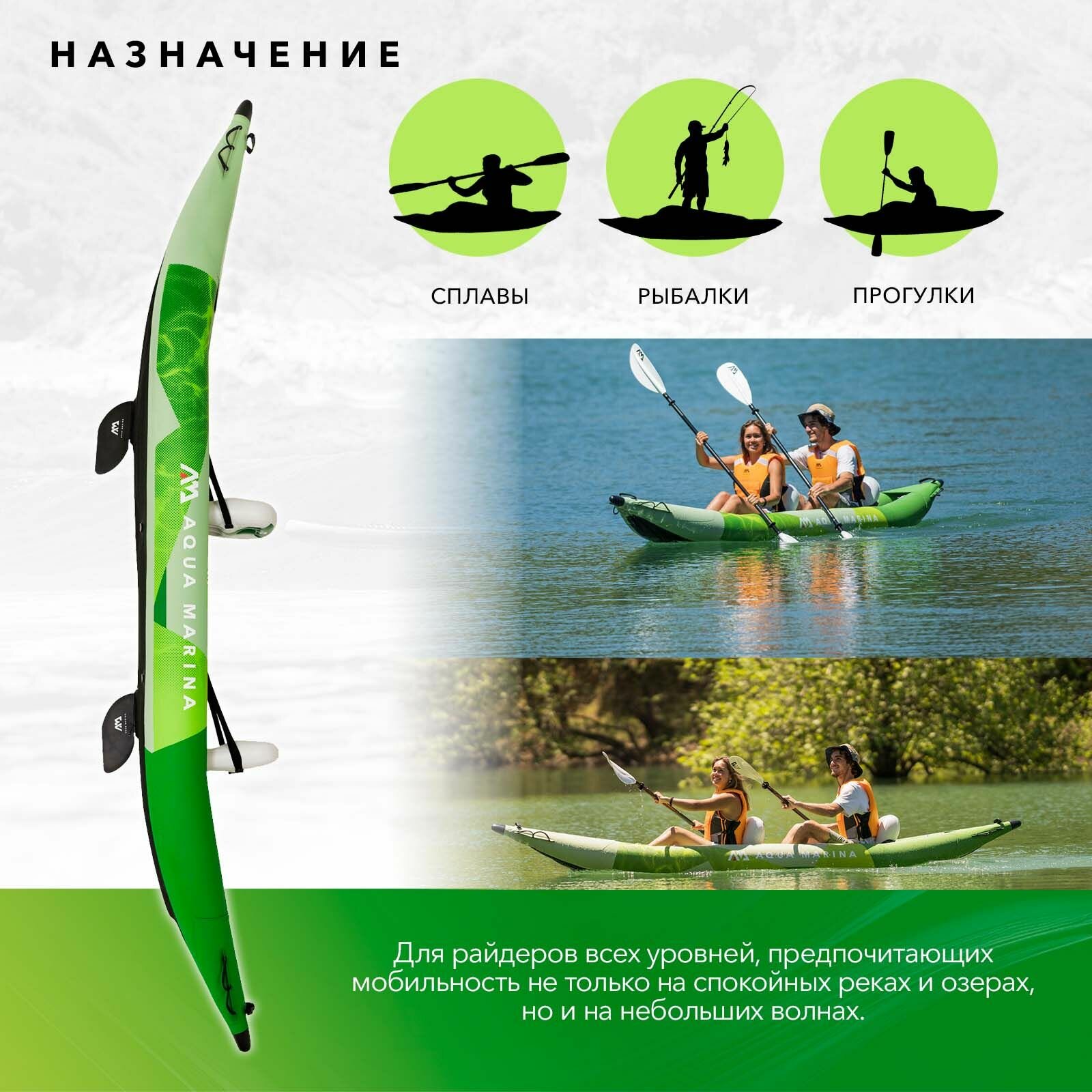 Надувной двухместный каяк AQUA MARINA Betta-412 с веслами в комплекте предназначен для водных прогулок с семьей или друзьями, а также для отдыха и развлечений на спокойных водоёмах. Легкий прогулочный каяк Betta-412 изготовлен из нескольких независимых воздушных камер из армированного ПВХ-материала с учетом требований безопасности, устойчивости и производительности. Абсолютно не требующий специальных навыков обслуживания, каяк прост в сборке и использовании, что делает его отличным плавсредством для всей семьи. Легкий в управлении и эксплуатации каяк Betta-412 станет отличным выбором для прогулки по ближайшему водоему.