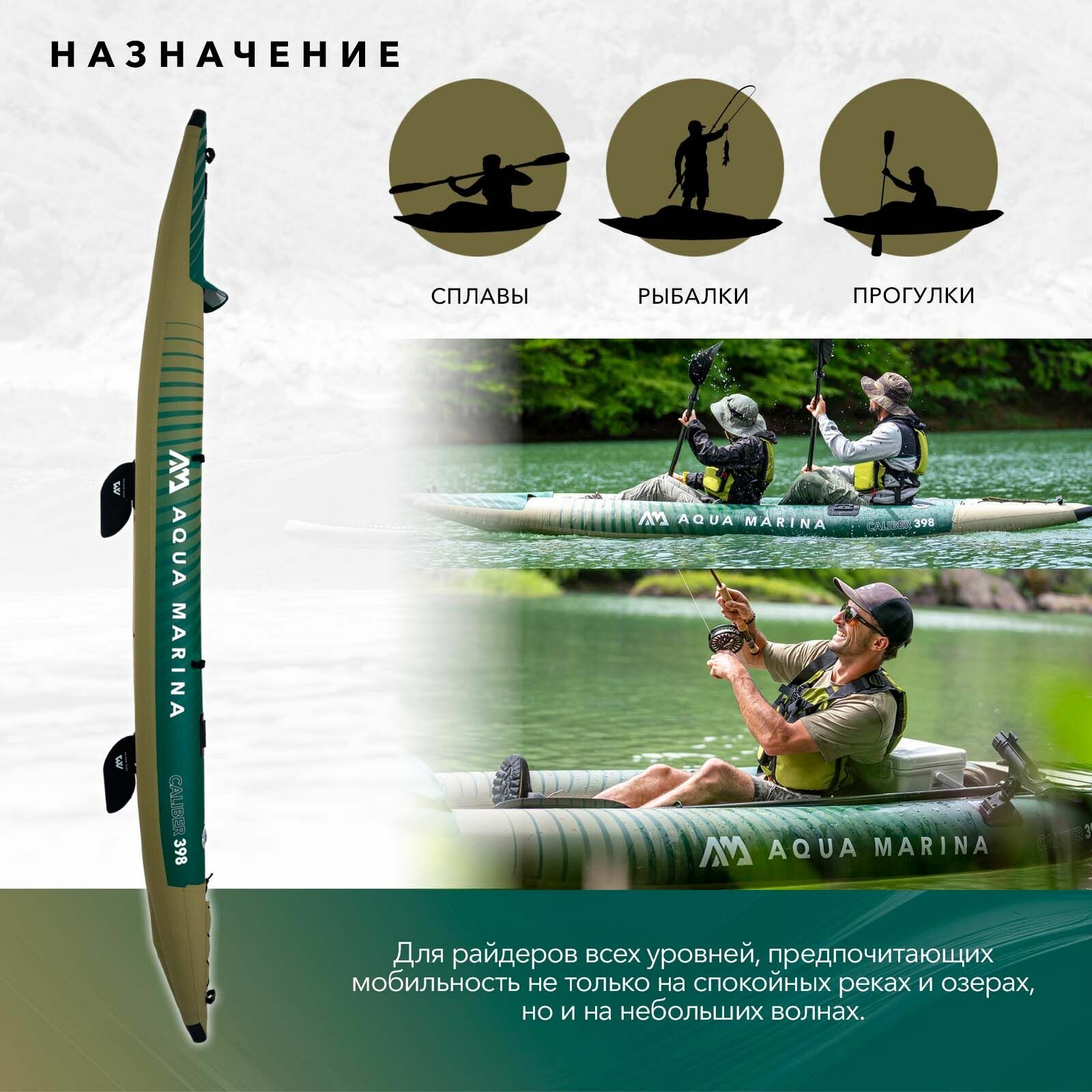 Каяк надувной одно — двухместный для рыбалки Aqua Marina Caliber размеры 398×98 см, в комплекте рюкзак, сиденье, насос, сиденье для рыбалки (CA-398): сравнение цен, характеристики, фото, актуальное наличие и цены.