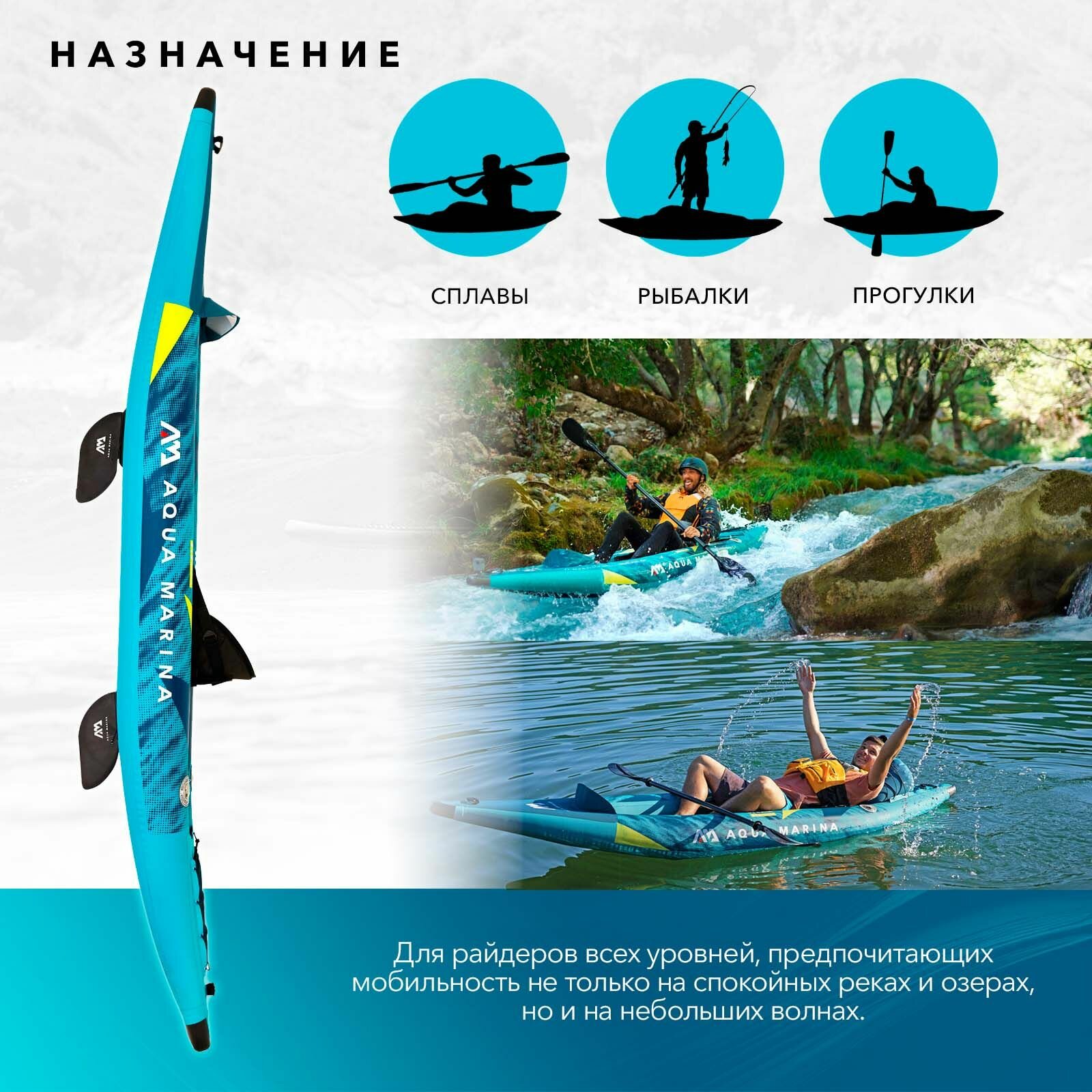 - А с учётом внедрения последних идей и технологий Aqua Marina, каяки получили оснащение, специально разработанное для достижения максимальной износостойкости и непотопляемости, достаточные для сплава по бурной воде и преодоления порогов горных рек.