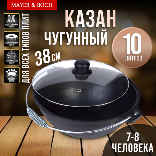 Казан MAYER&BOCH изготовлен из чугуна, традиционного высокопрочного и экологически чистого материала. Казан снабжен крышкой из термостойкого стекла и широкой металлической ручкой с удобным держателем. Казан идеально подходит для жарки продуктов на раскаленном масле и приготовления блюд азиатской кухни. Большой объем чугунка позволит приготовить сразу большое количество пищи. Такая посуда идеально подойдет для плова, шурпы, баранины. Высокая теплоемкость чугуна позволяет ему сильно нагреваться и медленно остывать, что обеспечивает равномерное приготовление пищи. Благодаря полукруглому дну пищу легко перемешивать. Чугун не вступает в реакцию с пищей в процессе ее приготовления. Подходит для использования на всех типах кухонных плит, а также на печи, снабженной конфоркой и на открытом огне. Котелок станет прекрасным подарком для любителей отдыха на природе.