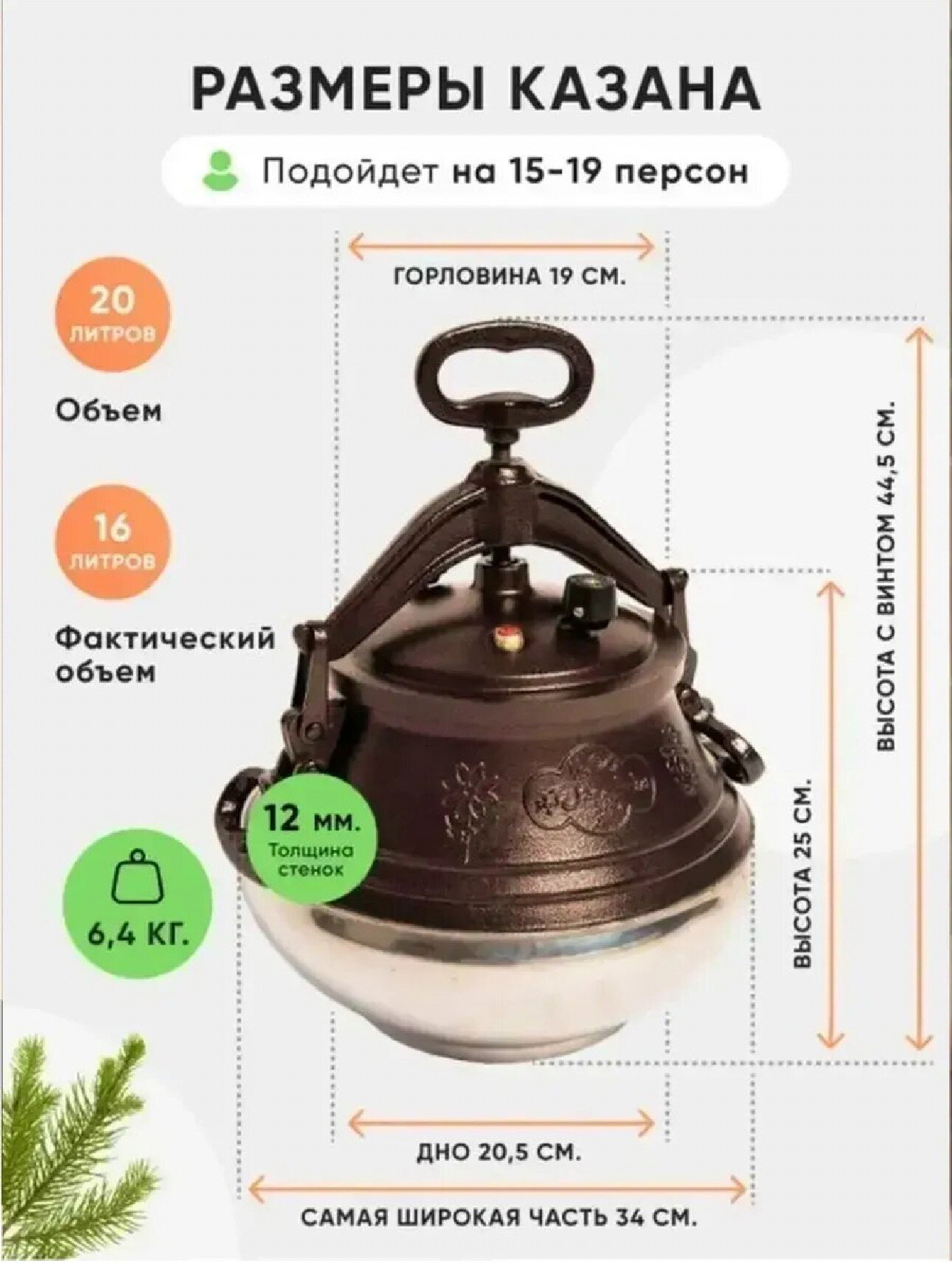 Главное отличие афганского казана от других — это массивная крышка, которая превращает емкость в скороварку. В такой посуде даже самое жесткое мясо готовится буквально за 15 минут. Готовить в нем можно на открытом огне, углях, газовой и электрической плите за счет идеального плоского дна (для индукционной плиты можно приобрести специальные адаптеры, которые продаются в нашем магазине). Удобно перемешивать пищу в казане, просто положить его на бок и покатать по поверхности, не нужно часто открывать крышку, и можно приобрести половник и шумовку которые отлично подойдут для казана, они представлены в данной карточке. Изготовлен казан из толстого алюминия и прослужит вам долгие годы. Полезный объём казана 65-80%, при загрузке более этой нормы возникает вероятность засорения клапана. Толщина стенок 11 мм. Объёмом посуды в 20 литров вы сможете удивить и накормить компанию до 15 персон одновременно. Высота общая в сборе - 445 мм, Ширина в широкой части - 340 мм, Диаметр дна - 205 мм. Диаметр горловины - 190 мм