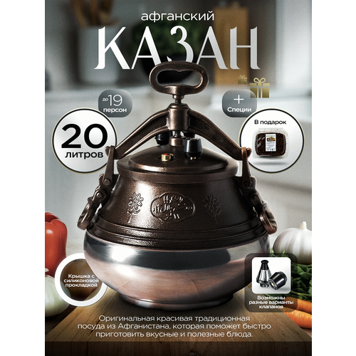 Двухцветный афганский казан скороварка Rashko Baba – это красивая традиционная посуда из Афганистана (оригинал), которая поможем быстро приготовить вкусные и полезные блюда. Прогрев внутри осуществляется равномерно, еда не пригорает, как и при использовании посуды с антипригарным покрытием, получается вкусной и ароматной. Подходит для приготовления вкуснейшего плова, супа, жарки и тушения мяса и овощей. Алюминиевый казан имеет небольшой вес и является незаменимым помощником в туризме походной кухне или уличном использовании – посуда идеальна для туристического похода, дачного отдыха, кемпинга, рыбалки, охоты. На природе, можно использовать с подставкой под казан - треногой. Также, казанок отлично подходит для домашнего использования на газовых, электрических плитах, газовых плитках. Его можно использовать как казан, котелок, скороварку, пароварку. Готовить можно с использованием металлических приборов шумовок и половников и другой утвари. Он может заменить привычные сковороды и кастрюли. Оснащен подвижными ручками для безопасного перемещения, имеет 3 клапана (2 рабочих и один аварийный), который предотвращает срыв крышки и надежным замком для плотной фиксации затвора к корпусу. В крышке установлена оригинальная силиконовая прокладка. Снаружи казан окрашен жаропрочной краской. Плоское дно, диаметром 20,5 см, позволяет готовить на варочных поверхностях, но на индукционной плите возможно использование только со специальным адаптером. Обратите внимание, что фактический объем казана меньше, информацию об этом Вы можете найти в соответствующем фото. Полезный объём казана 65-80%, при загрузке более этой нормы возникает вероятность засорения клапана. Подходит до 19 персон. Казан — это отличный подарок! В подарок к казану - приправа для плова 120 гр.