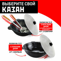 Казан чугунный 12 л (плоское дно) для костра и плиты с шумовкой, половником и специями: сравнение цен, характеристики, фото, актуальное наличие и цены.