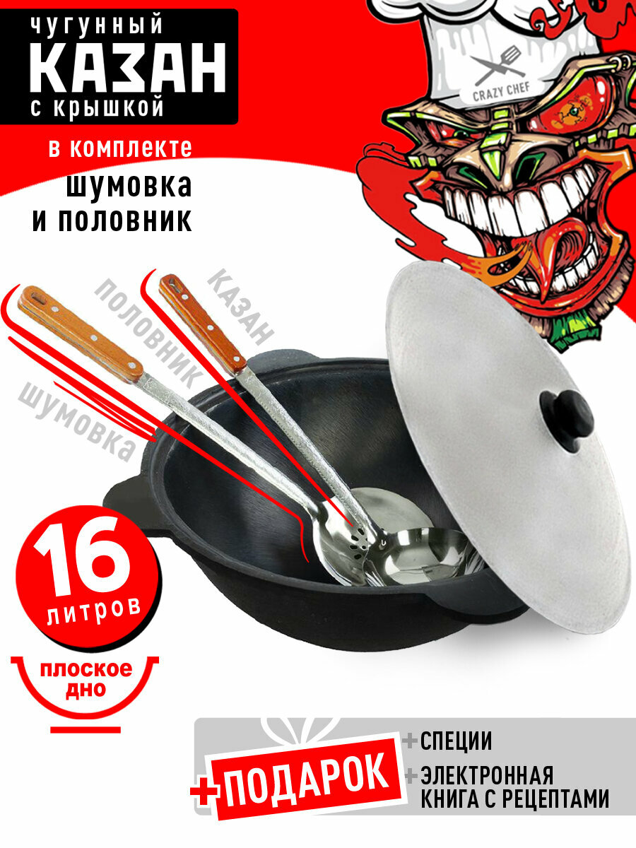 Казан чугунный 16 л (плоское дно) для костра и плиты с шумовкой, половником и специями: сравнение цен, характеристики, фото, актуальное наличие и цены.