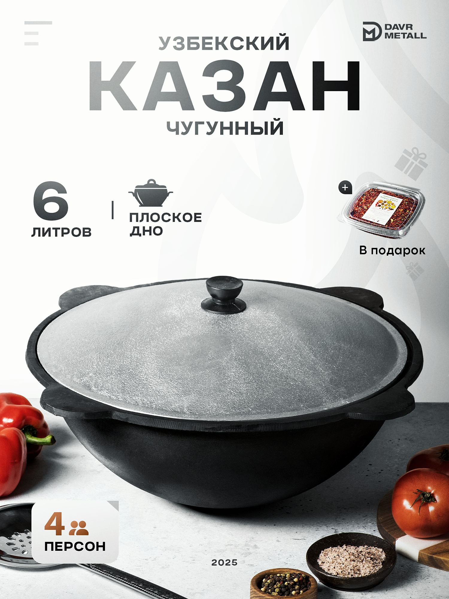 Купить Казан чугунный с крышкой 6 литров плоское дно + приправа для плова с доставкой по всей России. Казан чугунный с крышкой 6 литров плоское дно + приправа для плова: сравнение цен, характеристики, фото, актуальное наличие и цены.