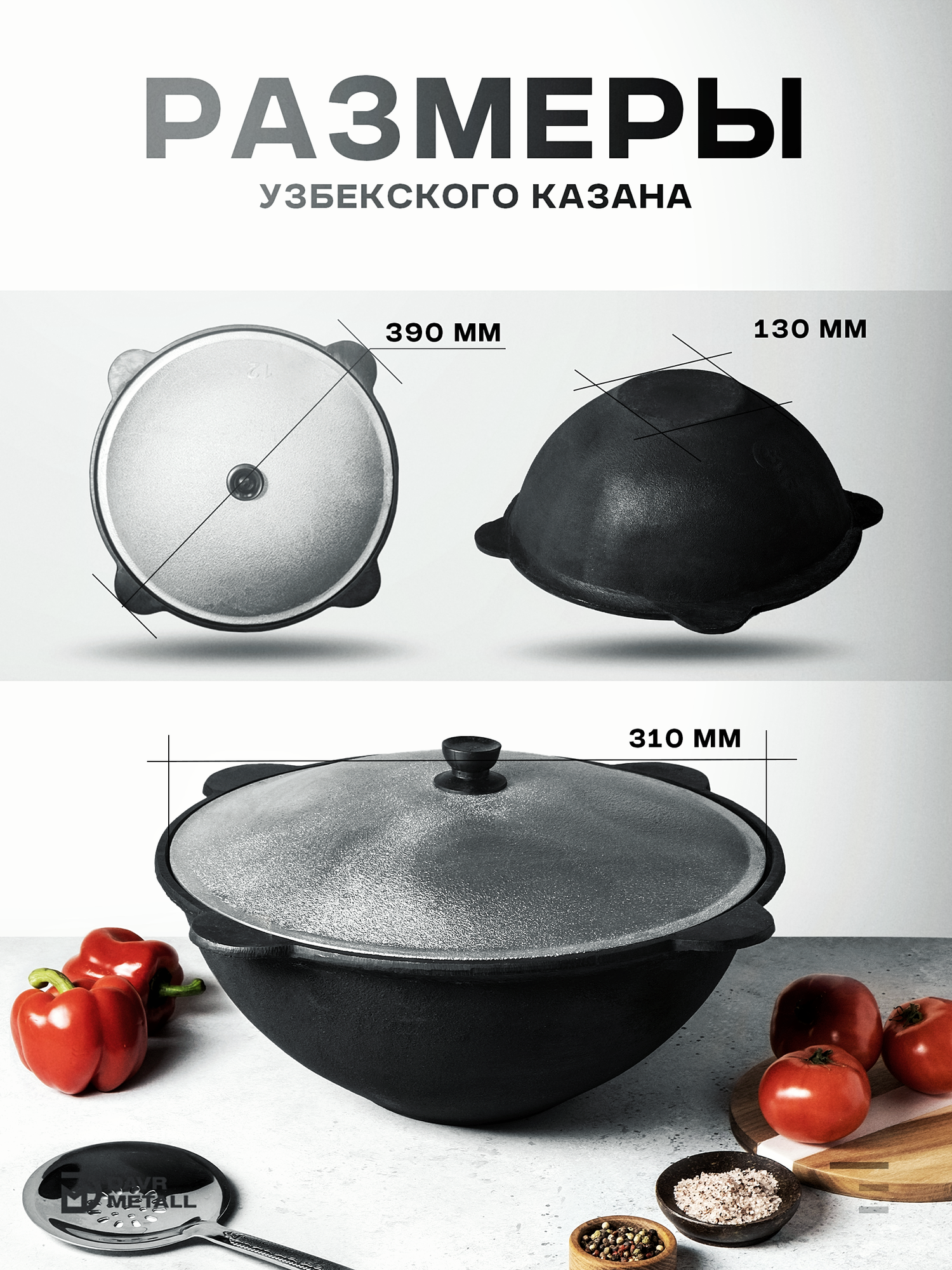 Казан чугунный 6 литров с крышкой производства Узбекистан Davr Metall город Наманган. Настоящий узбекский казанок для приготовления вкуснейшего плова, тушения мяса и овощей на 6 литров порадует любого хозяина дома. Качественный, плотный с крышкой изготовлен из металла ГОСТ. Толщина стенок казанка составляет 8 мм. Тяжелый, прочный весит около 7 кг вместе с упаковкой. Из настоящего чугуна блюда прогреваются всегда равномерно и очень долго сохраняют тепло. Любое блюдо, например, узбекский плов долго остаются теплыми. Блюда не подгорают, так как чугун имеет пористую структуру. Пористый металл впитывает масло и жиры, образуя естественный антипригарный слой на поверхности. Но и сейчас перед выпуском в продажу производитель обрабатывает казаны и другую чугунную посуду в натуральном хлопковом масле. Узбекский казан подходит для домашнего использования, кухни, костра, газовой и электрической плиты. Также можно использовать как походный для туризма, отдыха на природе, рыбалке. Готовить можно с использованием металлических предметов шумовок и половников. Металл не боится царапин и не теряет первоначального вида годами. Для защиты рук от случайных ожогов производитель установил не нагревающуюся ручку на крышку казана. Чтобы было легко поворачивать и удобно переносить, модель оснащена ручками в виде “ушек”. Кол-во ручек на узбекском казане - 4 шт. Перед первым использованием нужно прокалить. Внимание! Шумовка, солонки и другая утварь, изображенная на фото к товару, не входит в комплект и приобретается отдельно.