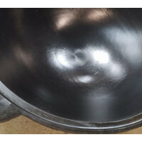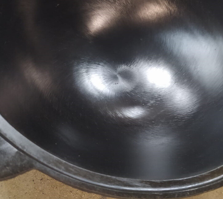 Внутри казан отшлифован, внутренняя поверхность гладкая. Снаружи казан на ощупь шероховатый из-за плотного слоя сажи, которая образуется в результате застывания производственного масла и долгого нахождения над газовой горелкой. Сажа не красит, вы не испачкаетесь, это так называемая антикоррозийная обработка металла.