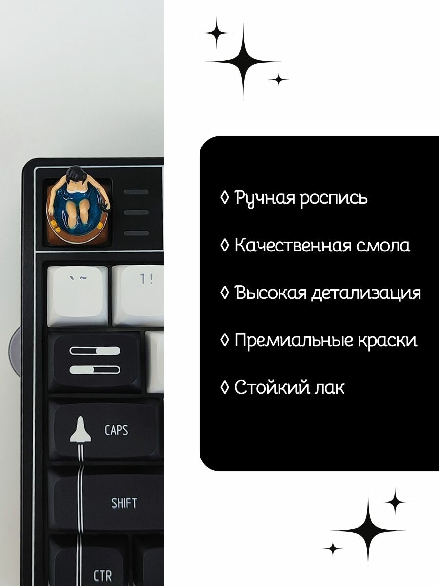 Позвольте себе окунуться в мир магии и харизмы Йеннифер с нашим кастомным кейкапом “Йеннифер в бадье”. Он станет не только стильным украшением вашей клавиатуры, но и постоянным напоминанием о любимой вселенной.
