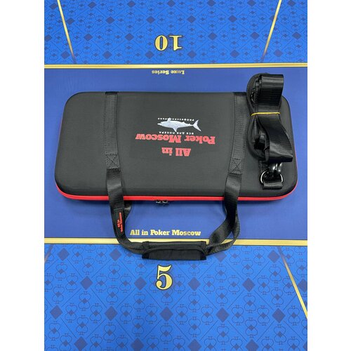 Кейс - сумка( с жесткими стенками) для хранения и транспортировки покерных фишек. Модель на 300 фишек, Фишку Дилер D75мм, Фишку All in треугольной формы, 2 колоды карт. Материал - ткань. Цвет - черный/красная молния