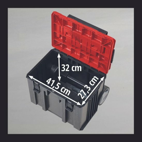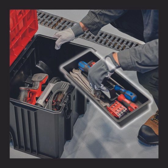 Кейс инструментальный системный является частью модульной системы E-Case компании Einhell. Он подходит для хранения и транспортировки в машине. Система блокировки обеспечивает соединение штабелированных кейсов, что позволяет легко транспортировать и хранить их. Кейс изготовлен из полипропилена и является брызгозащищенным, термозащищенный и ударопрочный благодаря высококачественному материалу. Устойчивая конструкция позволяет выдерживать общую полезную нагрузку до 120 кг. Большие колеса, а также телескопическая широкая рукоятка обеспечивают приятное передвижение по любой поверхности. Выдвижная эргономичная ручка обеспечивает комфорт при переноске. Кейс может быть оснащен навесным замком. Поставляется с лотком для ручного инструмента + стикером с надписью.
