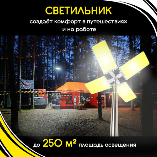 Фонарь для кемпинга — это универсальный и функциональный источник света, который пригодится не только в походных условиях, но и в повседневной жизни. Благодаря светодиодному освещению, состоящему из четырех ламп с 252 высокоинтенсивными SMD светодиодами (на каждой лампе), фонарь обеспечивает мощный световой поток в 6232 люмен. Это позволяет эффективно освещать пространство в ночное время, будь то на пикнике, в походе, на охоте или в качестве рабочего освещения.