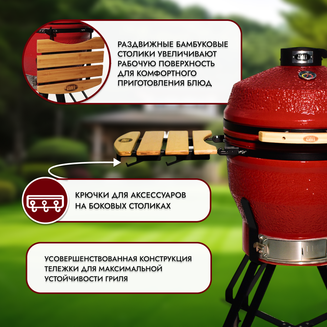 комплектация: складные бамбуковые столики, транспортировочные колеса, решетка гриль, держатель камня для пиццы, камень для пиццы, фирменный чехол, съемный золосборник;