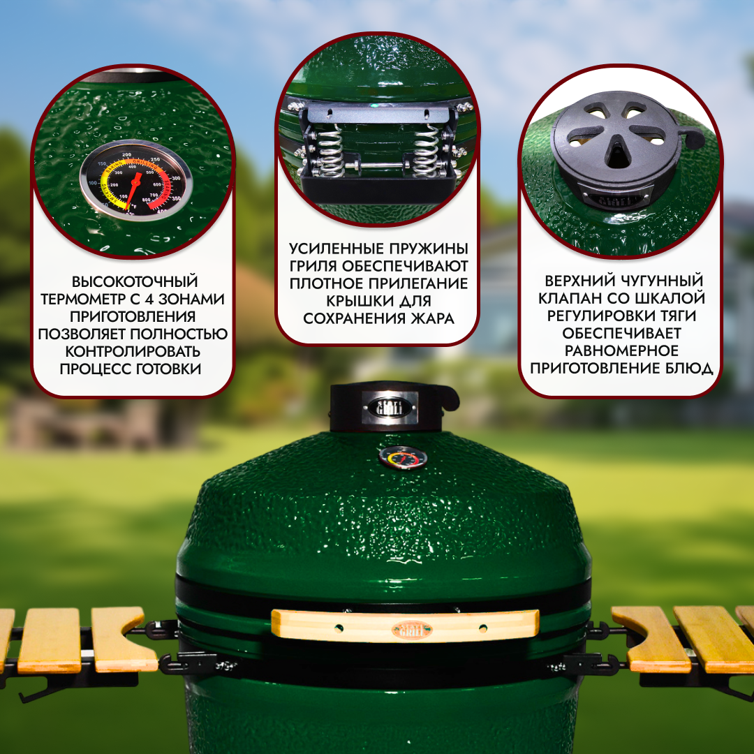 Данная модель относится к премиальной линейке семейства керамических грилей Start Grill. Новая уникальная внешняя текстура "камень", улучшенный состав керамической смеси, современное техническое решение в виде съемного золосборника, новая цветовая гамма, усиленные пружины крышки, а также улучшенная начальная комплектация — неоспоримые преимущества этой коллекции керамических грилей Start Grill. Start Grill SG22 одновременно сочетает в себе функции гриля, барбекю, мангала, коптильни, духовки, печи для пиццы и тандыра. Керамическая гриль выполнен из экологически чистой толстостенной керамики и очень прост в использовании, потребуется совсем немного времени, чтобы подготовить его к работе и начать готовить настоящие кулинарные шедевры. Отличительной особенностью данной модели является наличие съемного золосборника, что позволит с легкостью удалить золу по завершению приготовления. Установленный на крышке гриля высокоточный термометр позволит вам контролировать температуру внутри гриля. Уже входящие в комплект камень для пиццы с держателем, решетка на второй уровень позволят вам разнообразить свои кулинарные шедевры, а фирменный чехол сохранит ваш гриль в первозданном виде на долгие годы. Керамические грили Start Grill – идеальное соотношение цены, качества и функционала. При производстве гриля Start Grill используются самые прочные и долговечные материалы, которые не боятся ни коррозии, ни перепадов температур и позволяют сохранить презентабельный вид изделия на многие годы. Перед сборкой гриля ознакомьтесь с инструкцией, которая входит в комплектацию модели, а также следуйте всем правилам эксплуатации. Размер: 56 см / 22"; Цвет: зелёный; Толщина стенки: 20 мм; Диаметр изделия: 560 мм; Диаметр жарочной поверхности: 467 мм; Высота корпуса: 760 мм; Комплектация: складные бамбуковые столики, транспортировочные колеса, решетка гриль, держатель камня для пиццы, камень для пиццы, фирменный чехол, съемный золосборник; Материалы обруча, кронштейна, тележки: сталь; Артикул SG22; Габариты упаковки 1: 640 x 638 x 760 мм; Габариты упаковки 2: 600 x 440 x 200 мм; ВЕС нетто / брутто: 91 / 101 кг.
