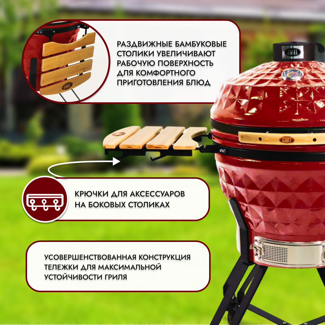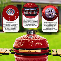 Данная модель относится к премиальной линейке семейства керамических грилей Start Grill. Новая уникальная внешняя текстура "Бриллиант", улучшенный состав керамической смеси, новое техническое решение в виде съемного золосборника, новая цветовая гамма, усилtнные пружины крышки, а также улучшенная начальная комплектация - являются неоспоримыми преимуществами керамических грилей Start Grill. Start Grill SG24 одновременно сочетает в себе функции гриля, барбекю, мангала, коптильни, духовки, печи для пиццы и тандыра. Гриль выполнен из экологически чистой толстостенной керамики и очень прост в использовании, потребуется совсем немного времени, чтобы подготовить его к работе и начать готовить настоящие кулинарные шедевры. Отличительной особенностью данной модели является наличие съемного золосборника, что позволит с легкостью удалить золу по завершению приготовления. Установленный на крышке гриля высокоточный термометр позволит вам контролировать температуру внутри гриля. Уже входящие в комплект камень для пиццы с держателем позволят вам разнообразить свои кулинарные шедевры, а фирменный чехол сохранит ваш гриль в первозданном виде на долгие годы. Керамические грили Start Grill – идеальное соотношение цены, качества и функционала. При производстве гриля Start Grill используются самые прочные и долговечные материалы, которые не боятся ни коррозии, ни перепадов температур и позволяют сохранить презентабельный вид изделия на многие годы. Перед сборкой гриля ознакомьтесь с инструкцией, которая входит в комплектацию модели, а также следуйте всем правилам эксплуатации. Размер: 61 см / 24"; цвет: красный; толщина стенки: 20 мм; диаметр изделия: 610 мм; диаметр жарочной поверхности: 525 мм; высота корпуса: 755 мм; комплектация: складные бамбуковые столики, транспортировочные колеса, решетка гриль, держатель камня для пиццы, камень для пиццы, фирменный чехол, съемный золосборник; материалы корпуса, кронштейна, тележки: сталь; артикул: SG24; габариты упаковки 1: 800 x 700 x 720 мм; габариты упаковки 2: 700 x 750 x 140 мм; ВЕС нетто / брутто: 100 / 115 кг.