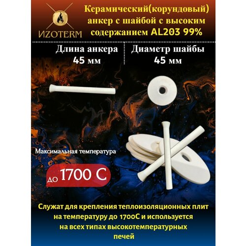 Керамические (корундовые) анкера с шайбами с высоким содержанием Al2O3 99% служат для крепления теплоизоляционных плит на температуру до 1700С и используются на всех типах высокотемпературных печей. Комплект крепежа состоит из корундового анкера и корундовой шайбы. Анкера имеют резьбу на одной из сторон, что позволяет закреплять их на фехралевую шпильку или болт с внешней строны печи. Корундовые анкера изготавливаются из высокочистого корунда (не менее 99% Al2O3), что позволяет им работать на температуры до 1700С. В отличии от других типов анкеров, данный тип не выскальзывает из шайб и не требует дополнительных подтяжек в ходе эксплуатации печей, что постоянно происходит с термокерамическими анкерами других производителей. На складе всегда имеются следующие виды керамических анкеров: 1) Анкер длинный - 120 мм 2) Анкер короткий - 45 мм