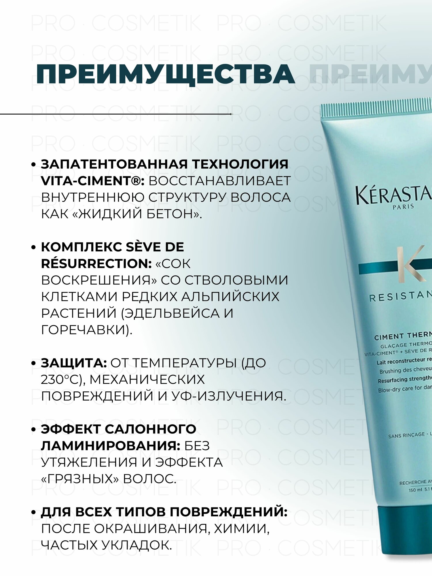 Восстанавливающее молочко для защиты и укрепления ослабленных волос. Уход, препятствующий ломкости волос. Эффект Термо-Запечатывания: разглаживает материю волос, придает невероятный блеск, облегчает процесс укладки. Ciment Thermique укрепляет волосы, подготавливая их к укладке феном и другими стайлерами.
