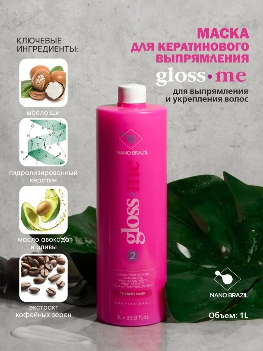 | Инструкция по применению | Тщательно вымыть волосы 1-3 раза шампунем глубокой очистки Gloss Me. Вспенить и оставить для воздействия на 3-5 минут. Тщательно промыть волосы водой. Высушить волосы на 100% по направлению от лица и по росту волос. Разделить волосы на 4 части. Взболтать маску (перед тем как налить в миску), Gloss Me и начиная с нижней затылочной зоны, нанести её на волосы кисточкой, отделяя тонкие пряди в 1,5 – 2 см и отступая от кожи головы 1 см. Каждую прядь прочесать расческой с частыми зубчиками, вычесывая излишки состава. Время выдержки состава 20-40 минут (в зависимости от состояния волос). Не смывая состав, высушить (чередуя теплым и прохладным воздухом фена) на 100% по направлению от лица и по росту волос. Разделить волосы на зоны. Приступить к выпрямлению волос с помощью утюжка с титановым или турмалиновым покрытием. Проутюжить каждую прядь (толщиной 0,5 – 1 см) 12-15 раз у корней, 7-10 раз по длине, 4-6 раз кончики, при t 180 – 230 °C (в зависимости от степени завитка и типа волос). Дать остыть 10-20 минут, или продуть прохладным воздухом фена 5-7 минут. Ополоснуть волосы водой. Не использовать шампунь для глубокой очистки! На просушенные полотенцем волосы нанести маску GLOSS ME, выдержать 7-10 минут, смыть водой. ВАЖНО: первое мытье производится БЕЗ использования шампуня! Высушить волосы феном и выполнить желаемую укладку. |