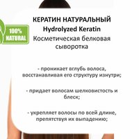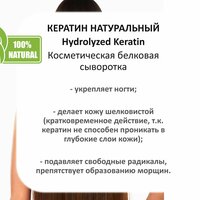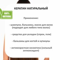 Человеческий волос состоит из Кератина на 88%. Кератин – это натуральный белок, обладающий высокой прочностью, входит в состав волос, ногтей, рогов и перьев у животных и птиц. Высокоэффективный и популярный компонент для ухода за волосами. Кератин имеет сходный состав с волосом и ногтем человека, он проникает в структуру волоса, занимая место поврежденных участков, улучшая его структуру, придавая блеск, силу и эластичность. Может применяться в составе средств направленных на борьбу с выпадением волос, а так же в бальзамах для укрепления ногтей. Широко используется в косметических средствах благодаря способности удерживать влагу. Незаменимый компонент по уходу за волосами. Молекула кератина, благодаря небольшому размеру, способна проникать вглубь волоса, восстанавливая его структуру изнутри. Придает волосам шелковистость и блеск, укрепляет их по всей длине, что препятствует выпадению. При регулярном использовании, волосы становятся более мягкими и послушными, уменьшается время укладки. Результат заметен уже после первого применения. Идеально подходит для ухода за ломкими, поврежденными окраской или частой горячей укладкой, волосами. При нанесении на кожу кератин делает ее шелковистой, но это всего лишь временный эффект, т. к. он не способен проникать в глубокие слои кожи и действие его будет кратковременным. Кератин обладает сильными антиоксидантными свойствами, подавляет свободные радикалы, препятствует образованию морщин, прекрасно подходит для anti-age косметики.