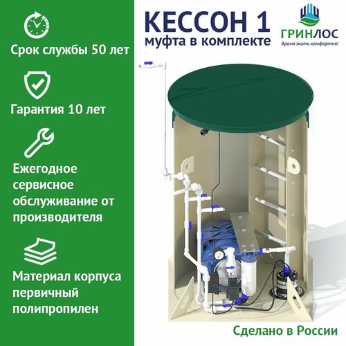 При использовании кессона гринлос, в качестве дополнения, например, к колодцу, внутри может размещаться: насосное оборудование, фильтры, гидроаккумулятор, запорная арматура, а также разведение трубопровода в разных направлениях, что позволяет сократить затраты на подключение дополнительных потребителей.