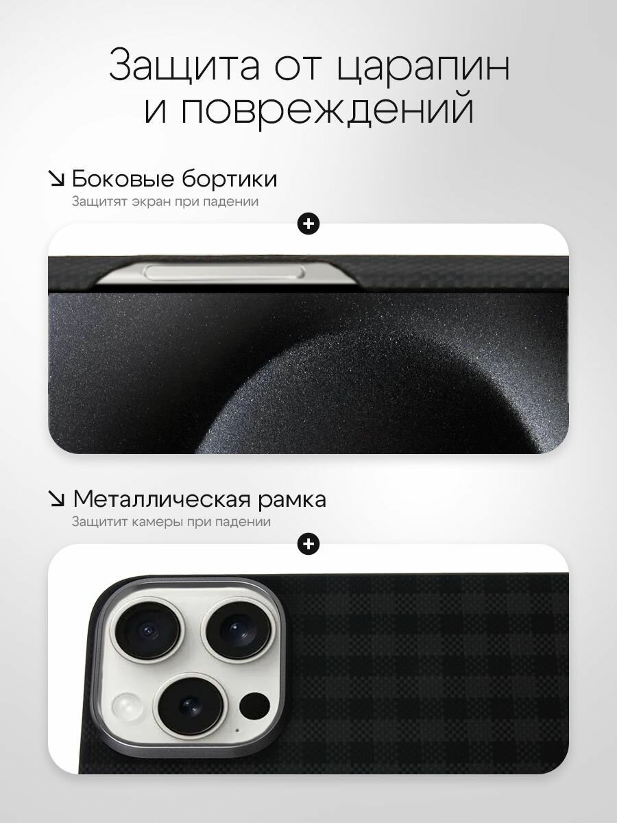 Наш кевларовый чехол на айфон 15 про имеет технологию углеродное волокно как у карбона, что обеспечивает его тонкий и ультратонкий профиль. Поэтому многие называют его карбоновый чехол на айфон 15 про. Карбоновый дизайн гарантирует, что ваш телефон останется защищенным без утяжеления. Не упустите возможность выбрать прочный и легкий чехол для вашего iphone, который также поддерживает технологию беспроводной зарядки магсейф (Magsafe) со всеми аксессуарами и в том числе Pitaka (питака).