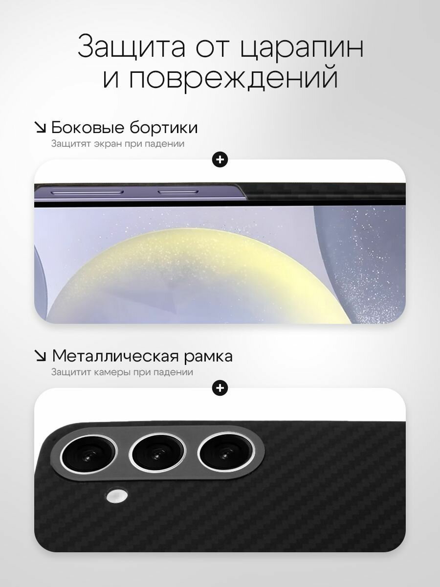 Наш кевларовый чехол на самсунг с24 плюс имеет технологию углеродное волокно как у карбона, что обеспечивает его тонкий и ультратонкий профиль. Поэтому многие называют его карбоновый чехол на самсунг с24 +. Карбоновый дизайн гарантирует, что ваш телефон останется защищенным без утяжеления. Не упустите возможность выбрать прочный и легкий чехол для вашего samsunga, который содержит магнит и также поддерживает технологию беспроводной зарядки магсейф (Magsafe) со всеми аксессуарами и в том числе Pitaka (питака).