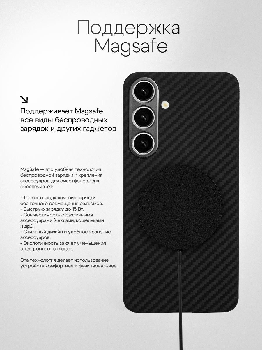 Наш кевларовый чехол на самсунг с24 имеет технологию углеродное волокно как у карбона, что обеспечивает его тонкий и ультратонкий профиль. Поэтому многие называют его карбоновый чехол на самсунг с24. Карбоновый дизайн гарантирует, что ваш телефон останется защищенным без утяжеления. Не упустите возможность выбрать прочный и легкий чехол для вашего samsunga, который содержит магнит и также поддерживает технологию беспроводной зарядки магсейф (Magsafe) со всеми аксессуарами и в том числе Pitaka (питака).