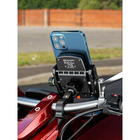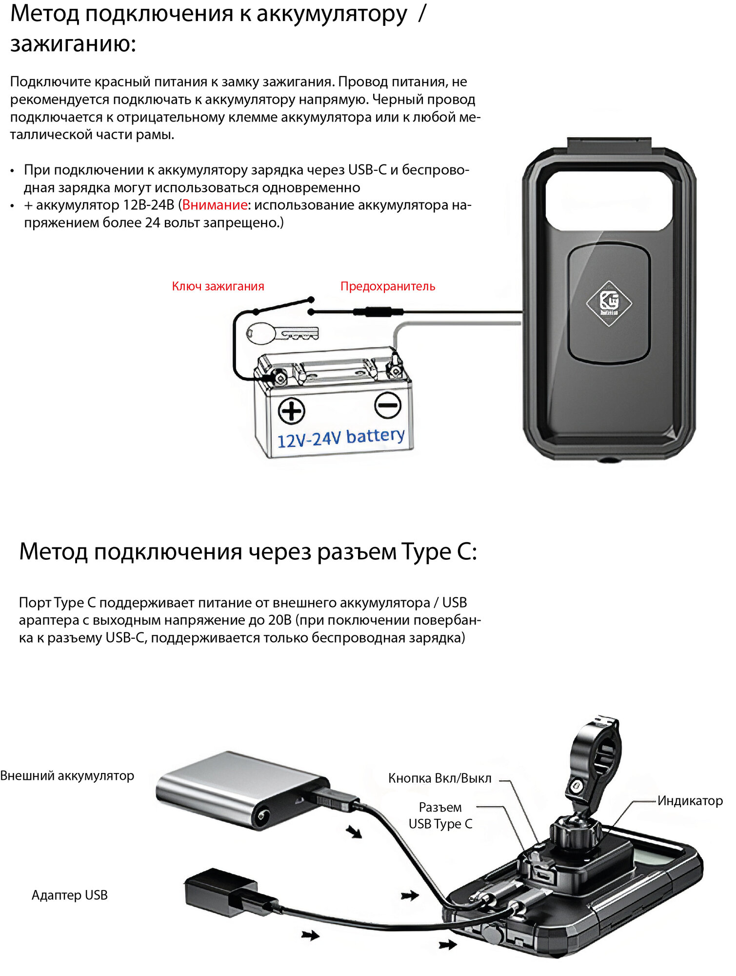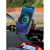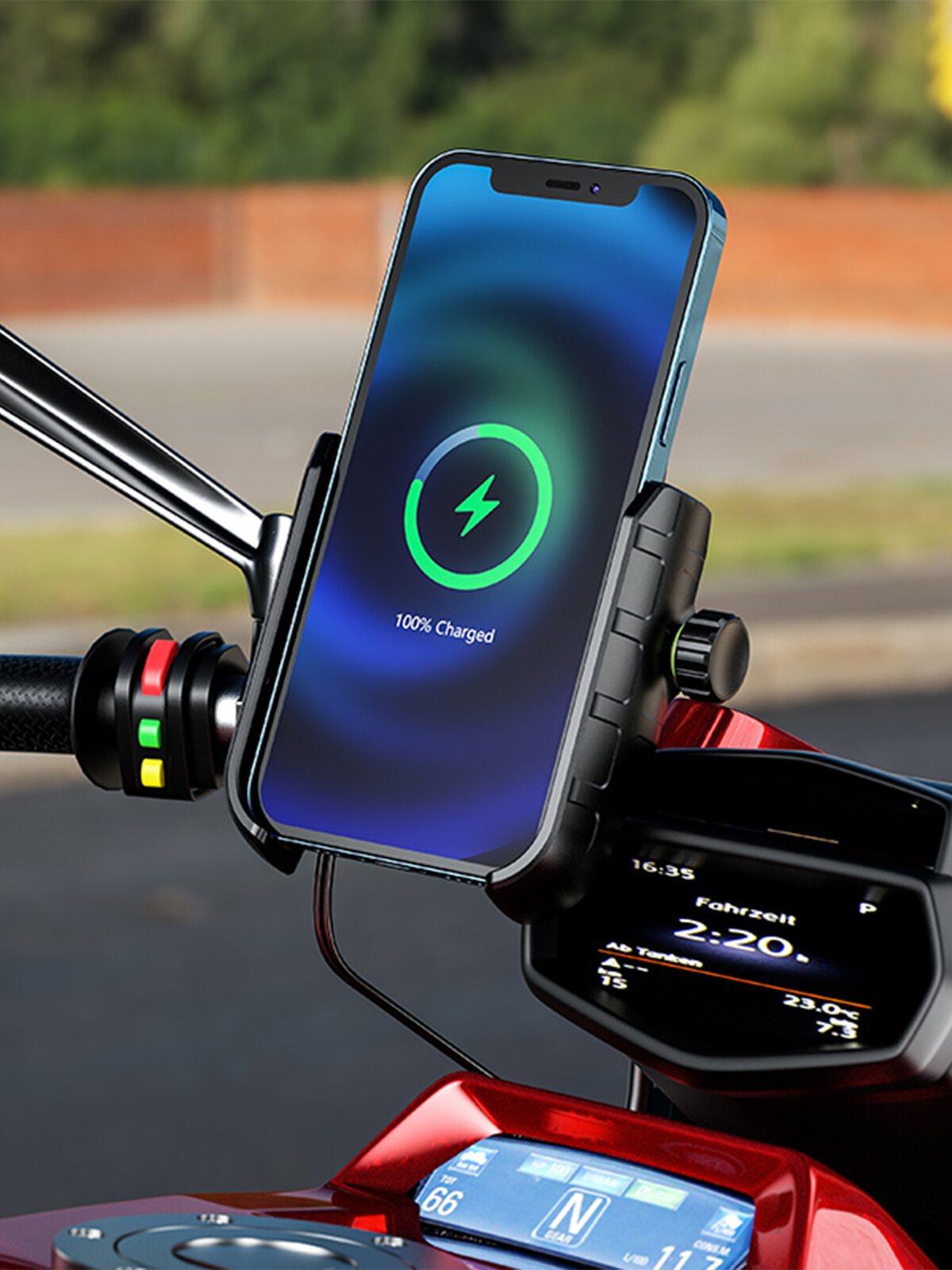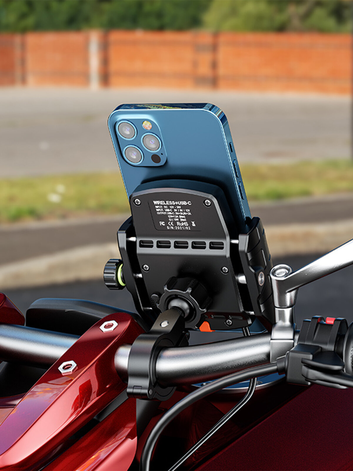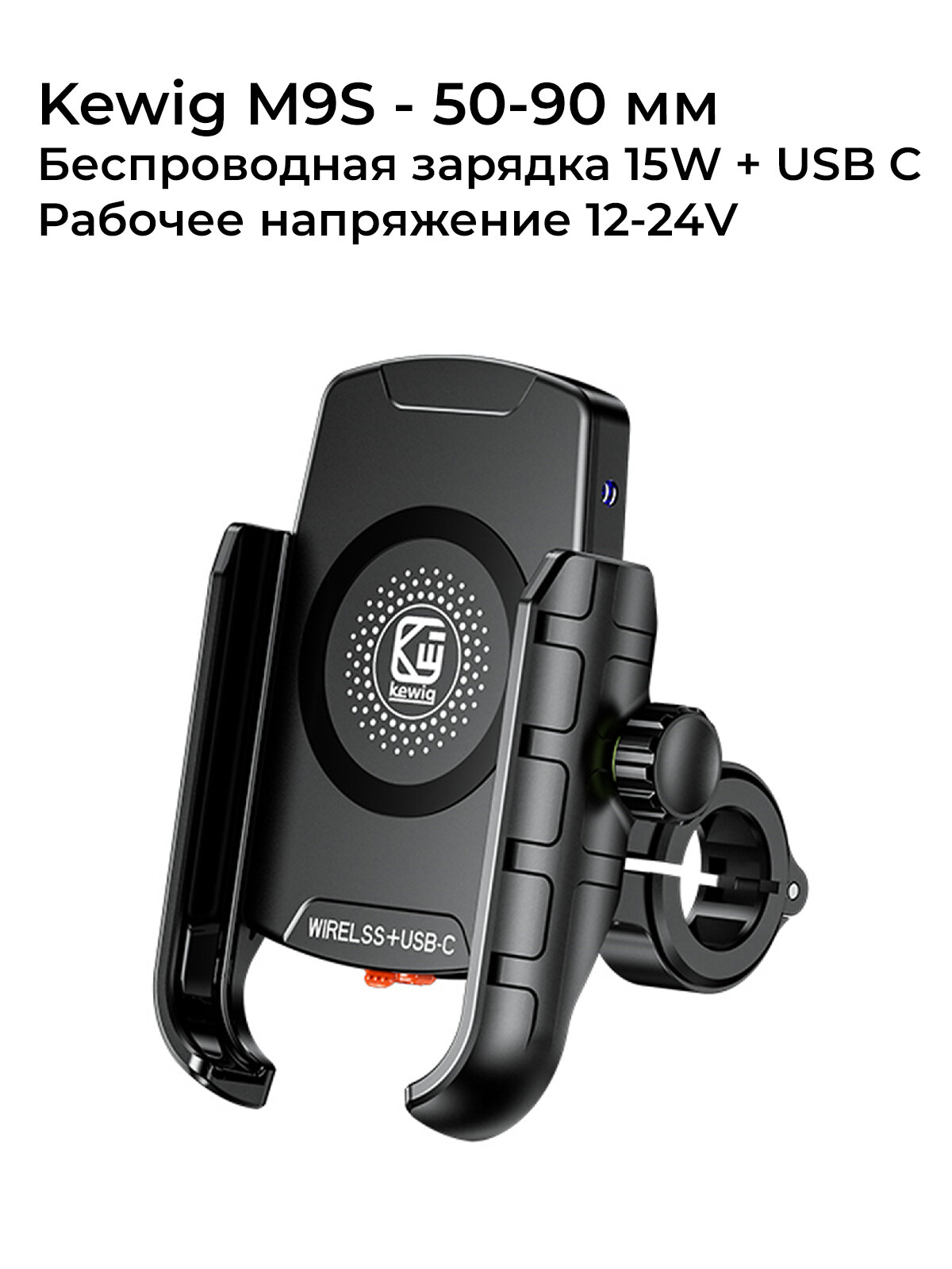 Держатель телефона Kewig M9S с функцией беспроводной зарядкой Qi 15W c креплением под руль KWG-R3. Kewig M9S — это универсальный держатель на руль мотоцикла, велосипеда, скутера, самоката, квадроцикла, снегохода со встроенной беспроводной зарядкой для телефонов с диагональю экрана 3.5 - 7 дюймов. Система расширения зажимов держателя является быстрой и простой в использовании, телефон жестко фиксируется с обеих сторон. Поворотный шарнир головки вращается на 360 градусов и позволяет установить телефон в удобном положении. Держатель можно закрепить практически на любой руль диаметром от 22 до 32 мм. Технические характеристики: Модель: M9S. Материал: Алюминиевый сплав. Корпус: Фиксирующий замок. Ширина зажимов: 50 - 90 мм. Максимальные размеры телефона: 89 x 179 x 19 мм. Влагозащищенность: IP6X. Способа крепления: на руль, в месте крепления зеркала под винт. Диаметр руля: 22 - 32 мм. Питание: DC 12 - 24V. Мощность беспроводной зарядки: 15W. Мощность USB: DC 5V - 3 А / 9V - 2.5А / 12V - 1.5A. Длина кабеля: 1.5 м. Телефоны поддерживающие беспроводную зарядку Qi: Apple - iPhone 8 iPhone 8 Plus, iPhone X, iPhone XS, iPhone XS Max, iPhone XR, iPhone 11, iPhone 11 Pro, iPhone 11 Pro Max, iPhone SE 2020, iPhone 12 mini, iPhone 12, iPhone 12 Pro, iPhone 12 Pro Max, iPhone 13 mini, iPhone 13, iPhone 13 Pro, iPhone 13 Pro Max - 7.5W (программно ограничен компанией Apple до 5W). Samsung - Note5, Note7, Note FE, Note8, Note9 S6, S6 Edge+, S6 Active, S7, S7 Edge, S7 Active, S8, S8+, S8 Active - 10W. Samsung - Note10 - 12W. Samsung - Note 10+, Note 10+ 5G, S9, S9+, S10, S10e, S10 5G, S10+W2016, W2017 (SM-W2017), Kelly SM-W2018, Galaxy S Lite (SM-G8750), Leadership 8 (SM-G9298), Galaxy Fold, S20, S20+, S20 FE, S20 Ultra 5G, Z Flip, Z Fold2 - 15WHUAWEI - Mate RS PORSCHE DESIGN - 10W. HUAWEI - Mate 20 Pro, Mate 20 RS PORSCHE DESIGN, P30 Pro - 15W. HUAWEI - Mate 30, Mate 30 Pro, Mate 30 5G, Mate 30 Pro 5G, Mate 30 RS PORSCHE DESIGN - 27W. Поддержка всех моделей на рынке 15 Вт / 10 Вт / 7,5 Вт