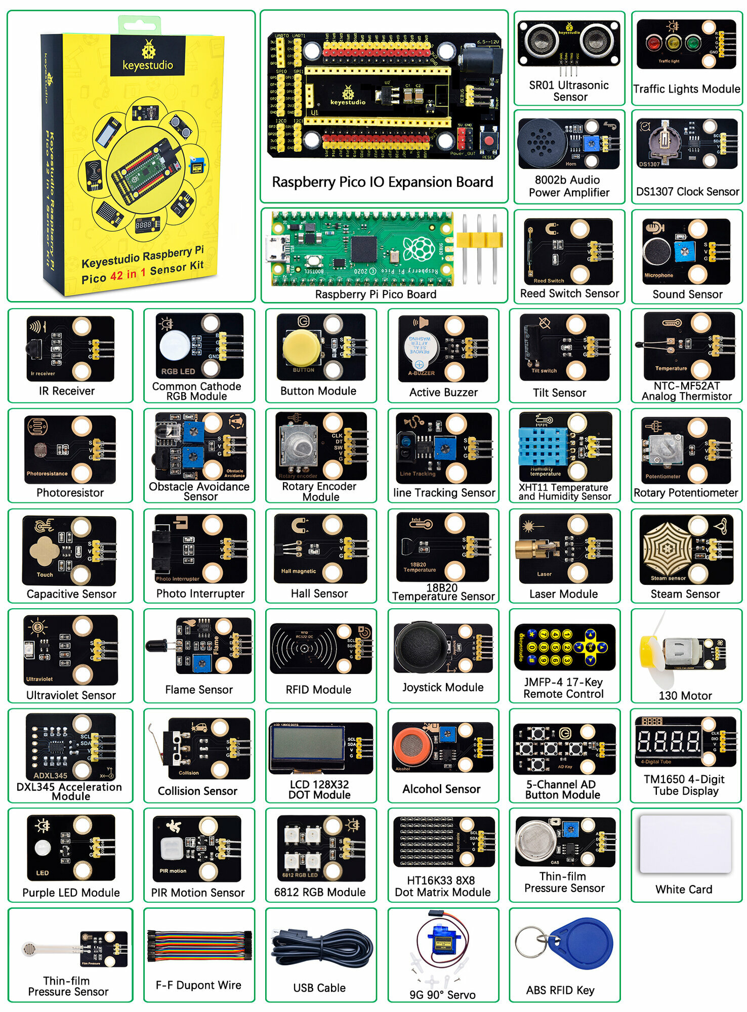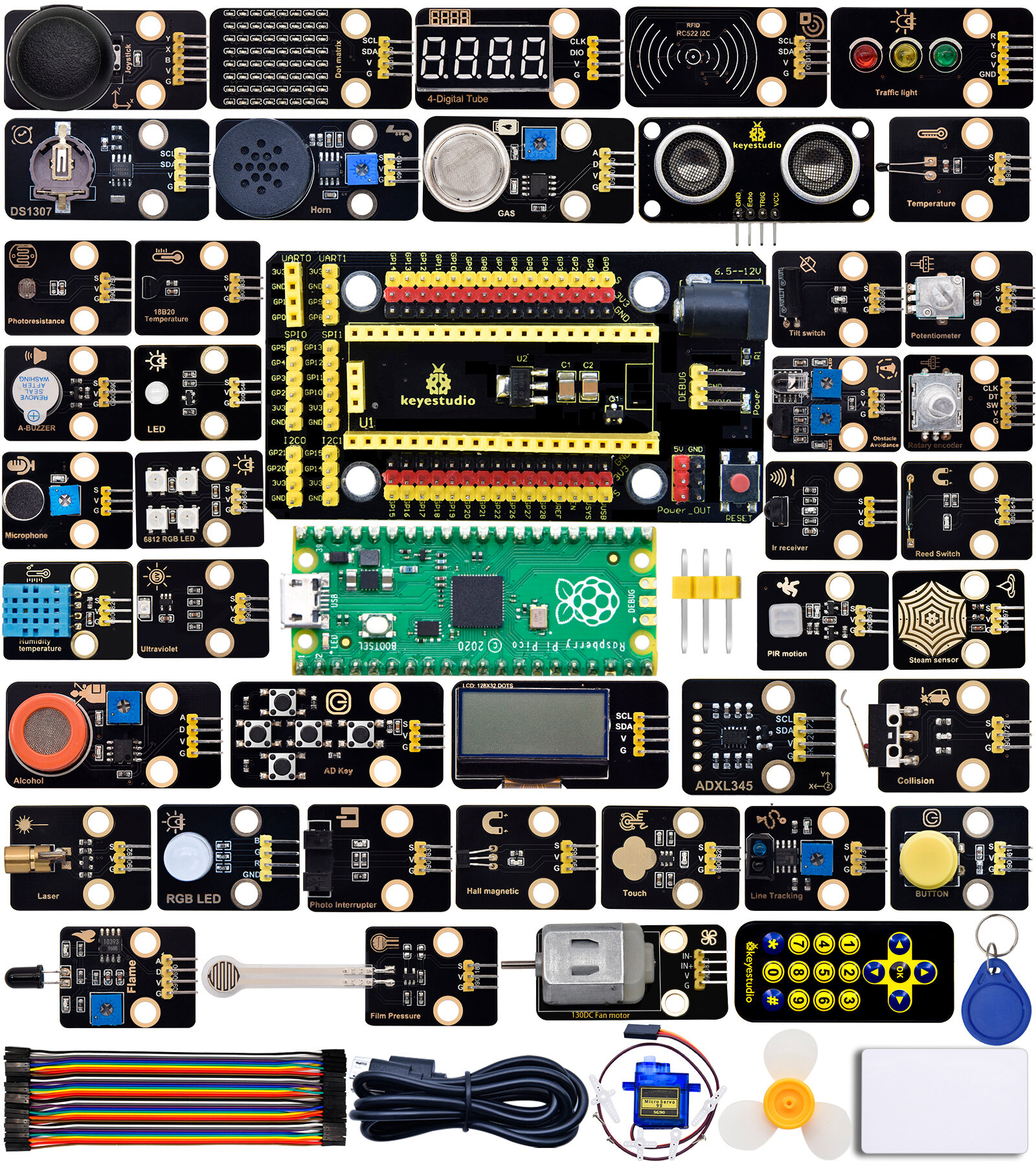 Keyestudio Raspberry Pi Pico 42 в 1 набор датчиков и модулей для обучения электронике, совместимый с Raspberry Pi Pico, с расширительной платой, проводами Dupont и уроками на MicroPython
