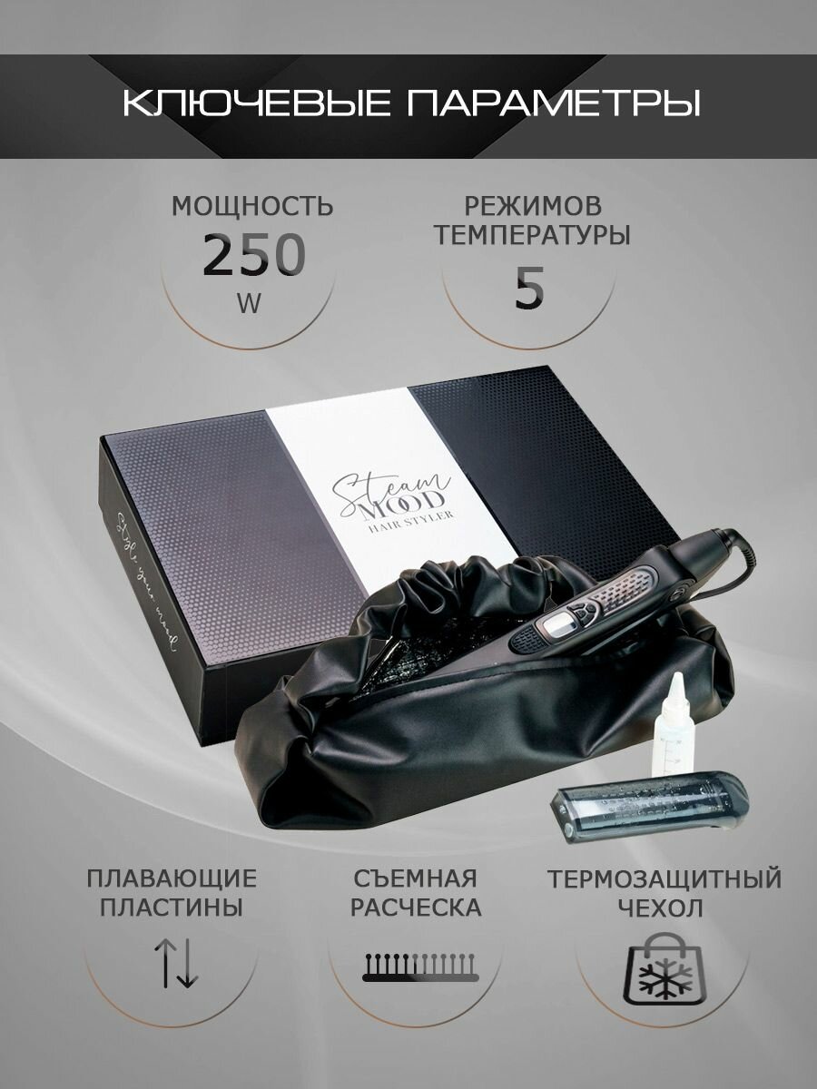 Паровой стайлер для волос Mood представляет собой инновацию в области укладки волос, сочетающую в себе передовые технологии и изысканный дизайн.