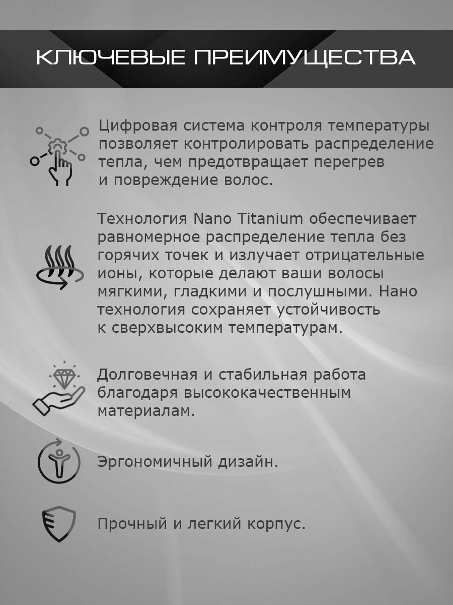 Разработанный для обеспечения высококачественного опыта укладки, этот выпрямитель оснащен цифровой системой контроля температуры , позволяющей пользователю точно выбирать желаемый уровень нагрева, вплоть до максимальной температуры 230°C. Эта функция делает его подходящим для различных типов волос, гарантируя оптимальные результаты как на тонких, так и на густых волосах.