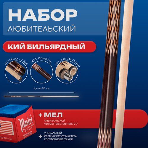 Кий для бильярда - главный и основной инструмент для игры в бильярд, предназначенный для нанесения ударов по бильярдному шару на бильярдном столе. Кий для русского бильярда двухсоставной изготовлен из прочного натурального дерева, длина которого составляет 160 - 161 см, вес около 690 - 740 г, а диаметр наклейки 12,4 - 13 мм. Бильярдный кий состоит из двух половинок, которые скручиваются между собой, делая его разборным и удобным для транспортировки. Нижняя часть кия называется турняк и имеет утяжелитель в основании, обшитого сверху деревом. Верхняя часть кия называется шафт, на завершающей части которой наклеена наклейка для кия, выполненная из прессованной и многослойной кожи, которая клеится на кий с помощью прокладки из микрофибры, для лучшей амортизации. Кий бильярдный имеет в нижней части резиновую накладку - подпятник, защищающий кии для русского бильярда от загрязнений и повреждений при ударе об пол. Скрутка стыка изготовлена из прочного полимерного материала, которая обеспечивает прочное соприкосновение. Балансировка кия стандартная - равномерное распределение груза, правильное расположение центра тяжести, соблюдение веса соединительных узлов. Совершенная балансировка кия способствует точности удара и гарантирует ровный замах, верное определение направления разгона и скорости кия. Хочется обратить внимание, что транспортировку к месту игр и тренировок рекомендуем осуществлять в подходящем по размеру чехле для кия, кейсе или тубусе, которые можно найти в разделе все для бильярда. Данный кий подойдет для игр в русский бильярд, русская пирамида, а также американский пул и снукер. Кии для бильярда сочетают в себе невысокую цену и хорошие игровые качества. Комплектуется мелом для бильярда «Мастер» от известного американского бренда Tweeten Fibre Co, который идеально подходит для мягких и средних наклеек.