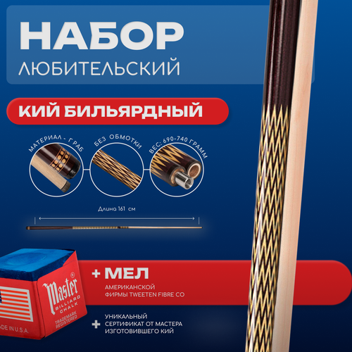 Кий для бильярда - главный и основной инструмент для игры в бильярд, предназначенный для нанесения ударов по бильярдному шару на бильярдном столе. Кий для русского бильярда двухсоставной изготовлен из прочного натурального дерева ценных пород, длина которого составляет 160-161 см, вес около 690 - 740 г, а диаметр наклейки 12,4 - 13 мм. Бильярдный кий состоит из двух половинок, которые скручиваются между собой, делая его разборным и удобным для транспортировки. Нижняя часть кия называется турняк и имеет утяжелитель в основании, обшитого сверху деревом. Верхняя часть кия называется шафт, на завершающей части которой наклеена наклейка для кия, выполненная из пресованной и многослойной кожи, которая клеится на кий с помощью прокладки из микрофибры, для лучшей амортизации. Кий бильярдный имеет в нижней части резиновую накладку - подпятник, зищищающий кии для русского бильярда от загрязнений и повреждений при ударе об пол. Скрутка стыка изготовлена из прочного полимерного материала, которая обеспечивает прочное соприкосновение. Балансировка кия стандартная - равномерное распределение груза, правильное расположение центра тяжести, соблюдение веса соединительных узлов. Совершенная балансировка кия способствует точности удара и гарантирует ровный замах, верное определение направления разгона и скорости кия. Хочется обратить внимание, что транспортировку к месту игр и тренировок рекомендуем осуществлять в подходящем по размеру чехле для кия, кейсе или тубусе, которые можно найти в разделе все для бильярда. Данный кий подойдет для игр в русский бильярд, русская пирамида, а также американский пул и снукер. Кии для бильярда сочетают в себе невысокую цену и хорошие игровые качества. Комплектуется мелом для бильярда «Мастер» от известного американского бренда Tweeten Fibre Co, который идеально подходит для мягких и средних наклеек.