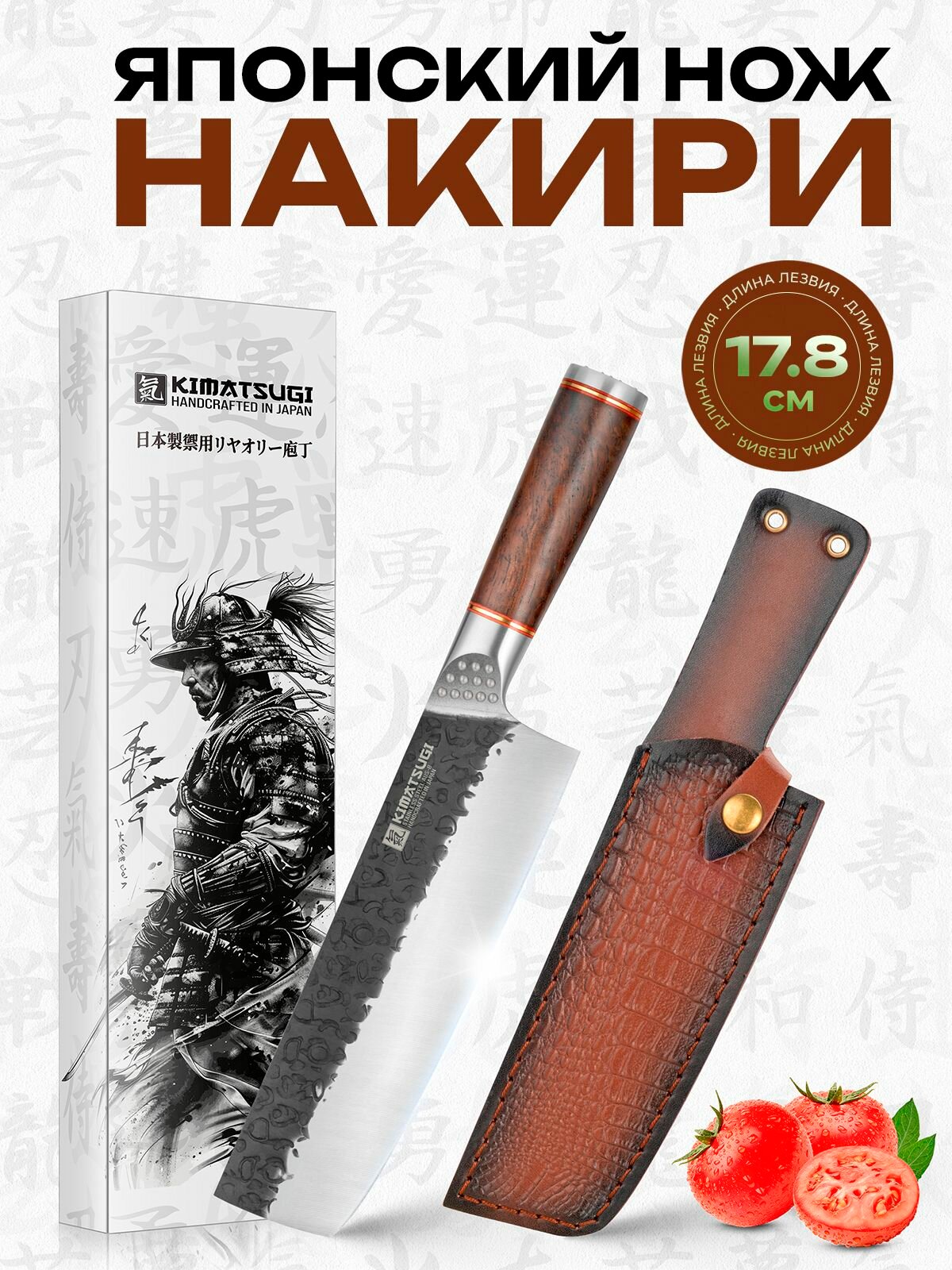 Купить Kimatsugi / Японский кухонный нож Накири PRO. Нержавеющая сталь AUS-8. Длина лезвия 17,8 см. Кожаные ножны в комплекте. В подарочной коробке с доставкой по всей России.