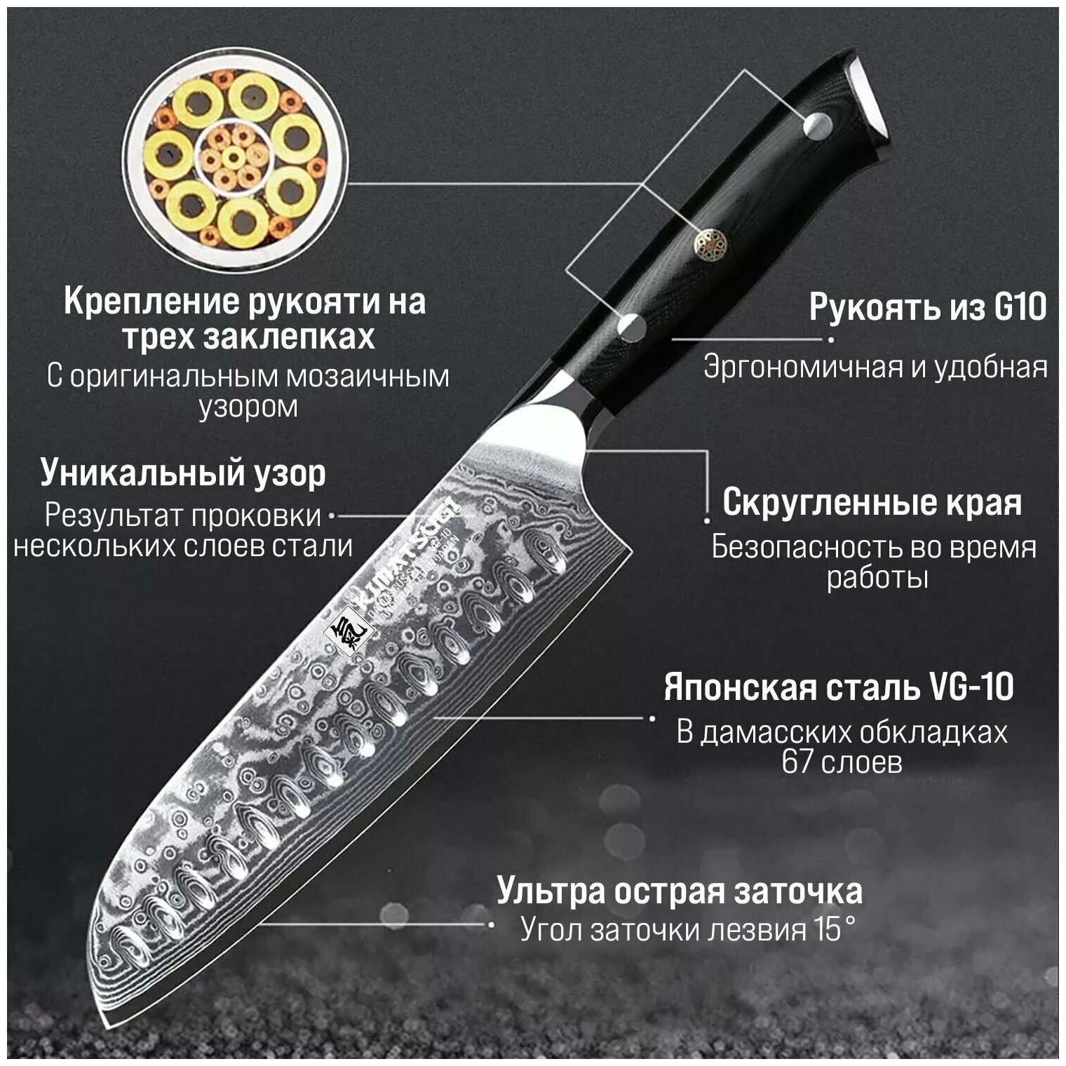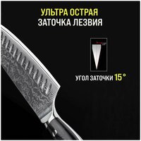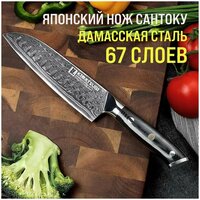 Кухонный нож Сантоку от японского производителя Kimatsugi (серия Damascus) подходит для разделки птицы, кролика, рыбных туш, нарезки стейков и рубленого фарша, шинковки капусты, овощей, фруктов, слайсирования гастрономии и прочих задач повара.