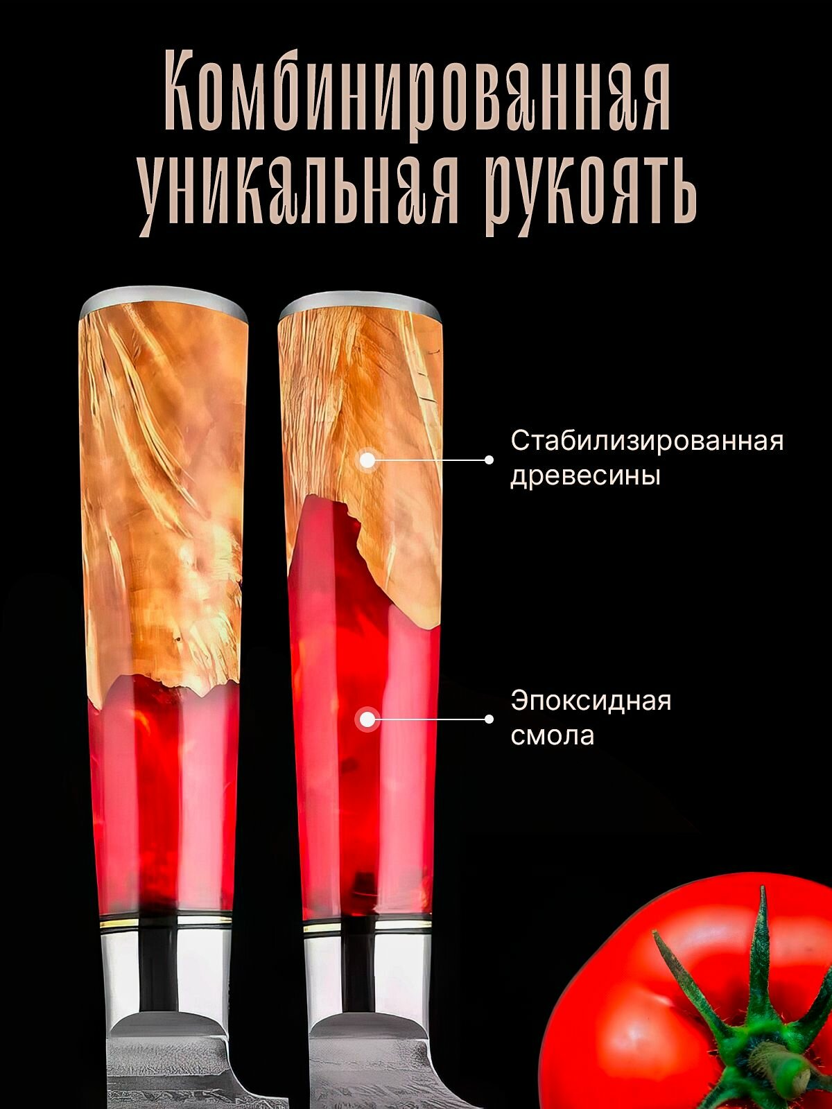 Рукоять, невероятно удобная, выполнена из из инновационного композитного материала (эпоксидная смола и стабилизированная древесина). Материал не впитывает влагу, не царапается, не стирается, устойчив к температурным перепадам и высоким нагрузкам. Рукоять приятная на ощупь, не натирает ладонь даже при долгой нарезке, так как умеет округлую форму и комфортно лежит в руке.