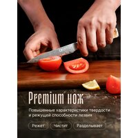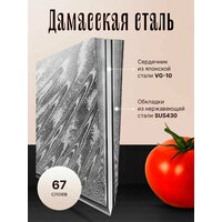 Лезвие профессионального ножа изготовлено из дамасской стали: центральный слой - из стали марки VG-10, 66 слоев боковых обкладок из стали SUS430.