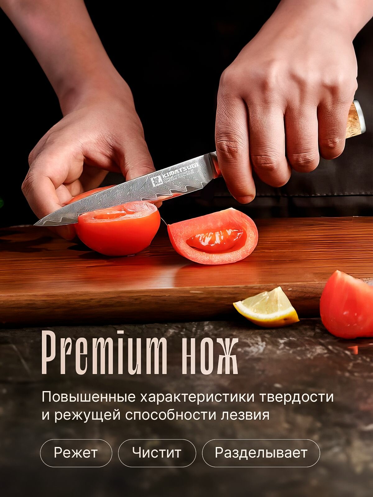 Японский кухонный овощной нож от японского производителя Kimatsugi (серия Damascus #116) - это небольшой по размеру нож, который служит для снятия кожуры и вырезания мелких фрагментов с разных плодов.