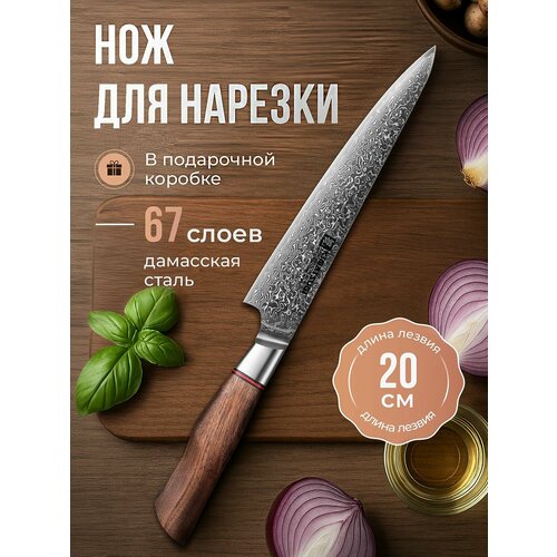 Сердечник лезвия обложен 66 слоями стали с добавками, защищающими от коррозии, истирания, повреждения, образующими на боковых гранях лезвия уникальный рисунок. Он не стирается со временем и свидетельствует о применении старинной дамасской технологии в производстве поварского ножа. Рукоять, невероятно удобная, выполнена из натурального дерева (красный сандал) с защитной пропиткой. Рукоять не впитывает влагу, не царапается, не стирается, устойчива к температурным перепадам и высоким нагрузкам. Она приятная на ощупь, не натирает ладонь даже при долгой нарезке, так как имеет эргономичную форму и комфортно лежит в руке.