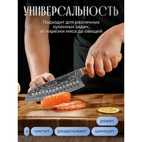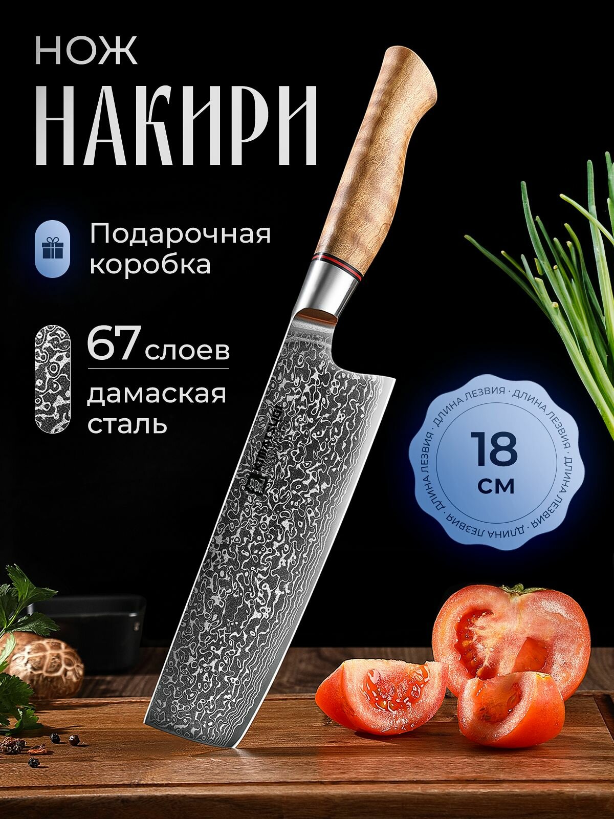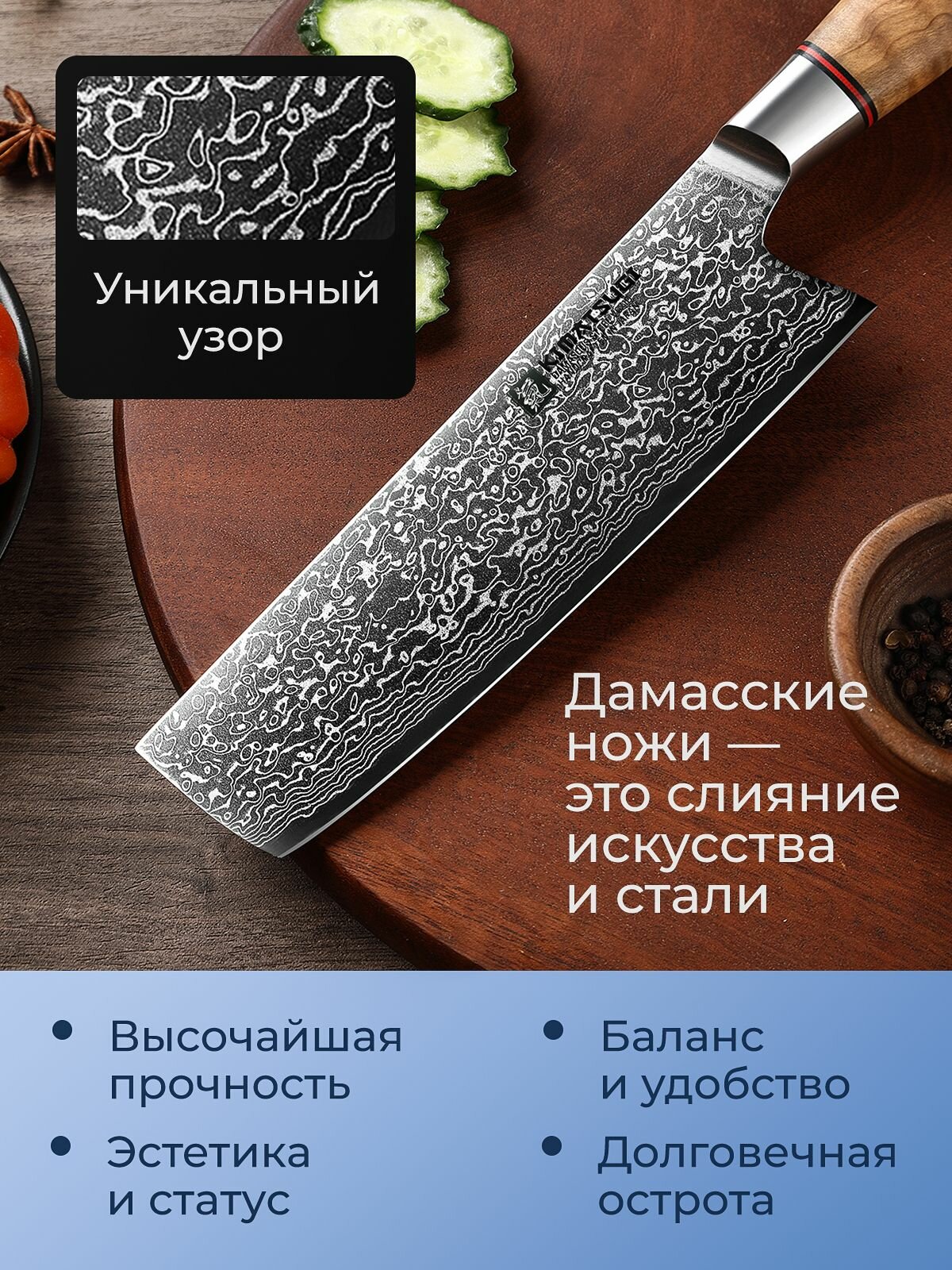 Поварской нож Накири от японского производителя Kimatsugi (серия Damascus #135) подходит для быстрой и точной нарезки овощей, рубки зелени и трав, работы с твердыми продуктами (тыква, редька, корнеплоды). Лучший выбор для вегетарианцев и любителей азиатской кухни.