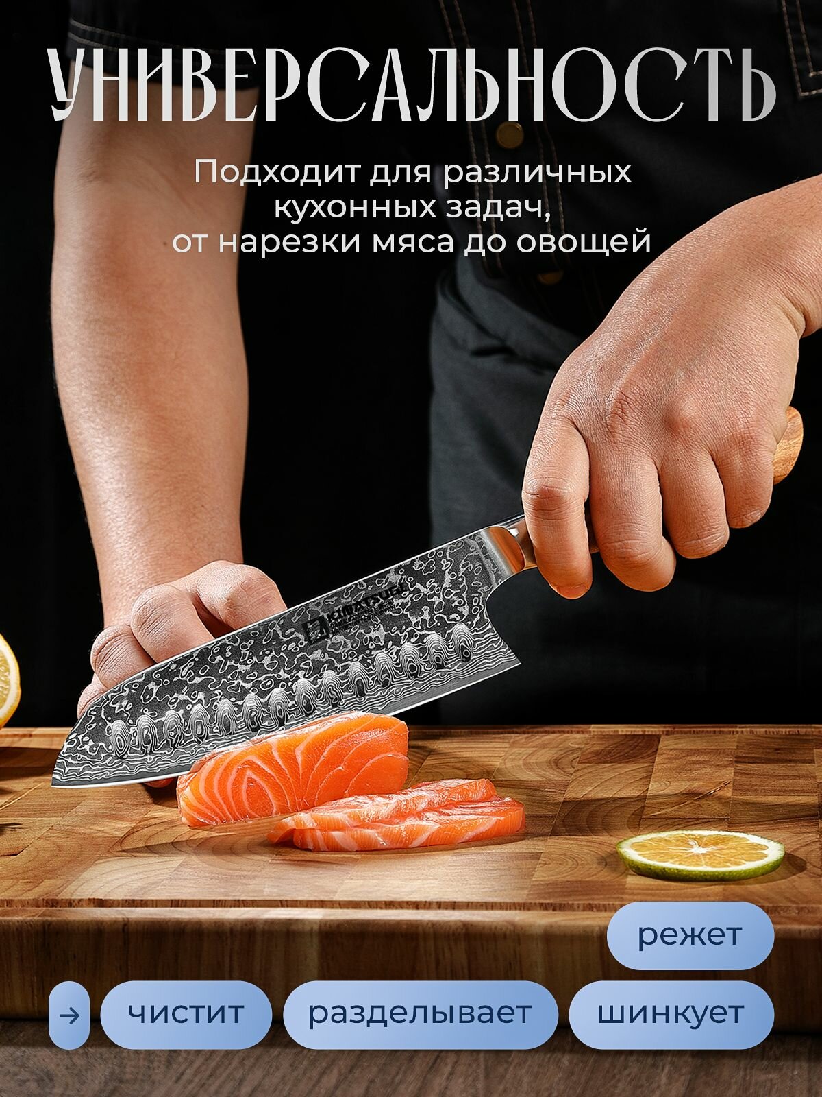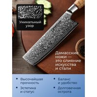 Сердечник лезвия обложен 66 слоями стали с добавками, защищающими от коррозии, истирания, повреждения, образующими на боковых гранях лезвия уникальный рисунок. Он не стирается со временем и свидетельствует о применении старинной дамасской технологии в производстве поварского ножа. Рукоять, невероятно удобная, выполнена из натурального оливкового дерева с защитной пропиткой. Рукоять не впитывает влагу, не царапается, не стирается, устойчива к температурным перепадам и высоким нагрузкам. Она приятная на ощупь, не натирает ладонь даже при долгой нарезке, так как имеет эргономичную форму и комфортно лежит в руке.